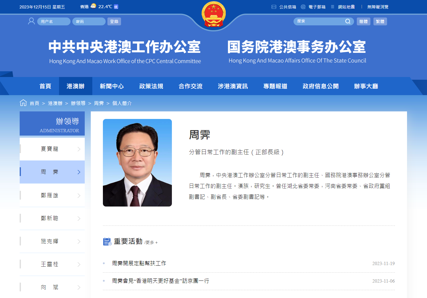 大公文匯全媒體報道,12月14日,國務院新聞辦舉行新年招待會,並發布《中央國家機關和地方2024年新聞發言人名錄》。中共中央港澳工作辦公室(加掛國務院港澳事務辦公室牌子)共有三位新聞發言人,分別是周霽、曾健和徐露穎。周霽為中央港澳辦分管日常工作的副主任,曾健為中央港澳辦七局局長,徐露穎為中央港澳辦七局副局長。