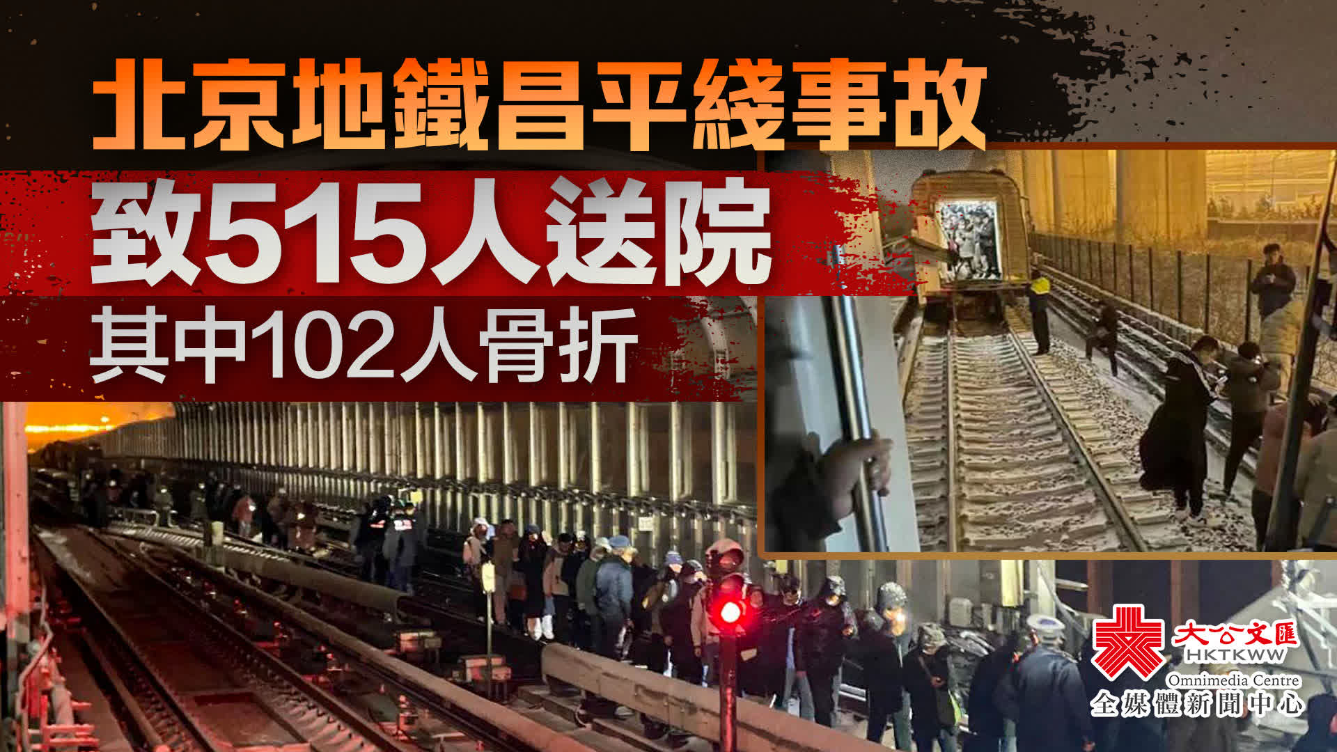 據央視新聞報道,12月14日18時57分,地鐵昌平綫西二旗至生命科學園上行區間,兩輛列車發生追尾事故,造成部分乘客受傷。事故發生後,北京市委市政府成立現場事故處置領導小組,交通、消防、衞健、公安、應急等部門和屬地政府迅速響應,全力以赴搶險救援,轉運傷員,轉移乘客。14日23時許,人員轉運完畢,現場處置工作基本結束,共有515人送醫院檢查,其中骨折102人,無人員死亡。截至今晨6時,423人已離院,25人留觀,67人住院治療。