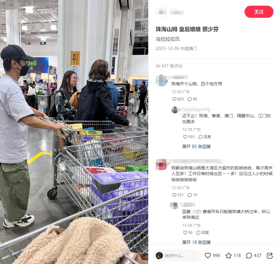 有網友在珠海山姆偶遇蔡少芬,看來皇后娘娘也喜歡逛大灣區的大超市!