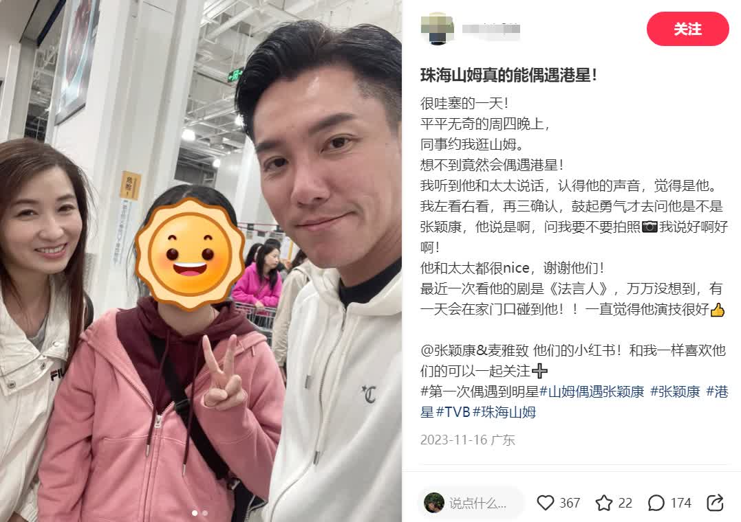 不僅在深圳山姆可以碰到男神,還有網友在珠海山姆捕捉野生張頴康,說想不到自己有一天在家門口碰到他。