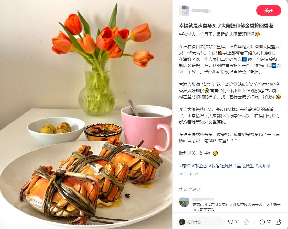有網友社交媒體分享自己的日常,表示幸福就是從盒馬買了大閘蟹和郁金香拎回香港。