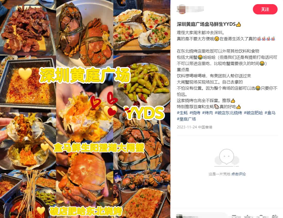 更有網友分享自己的吃喝玩路綫,去皇庭廣場吃燒烤,還能吃到大閘蟹!