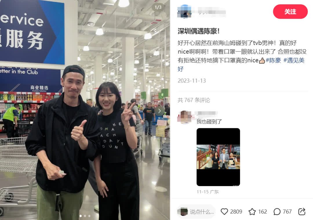 視帝陳豪近來忙於在深圳拍攝劇集《企業強人》,有網民於社交網分享在深圳山姆超市偶遇陳豪的照片,留言指:「好開心居然在(深圳)前海山姆碰到了TVB男神!真的好nice啊啊啊!戴着口罩一眼就認出來了,合照也都沒有拒絕還特地摘下口罩真的nice。」