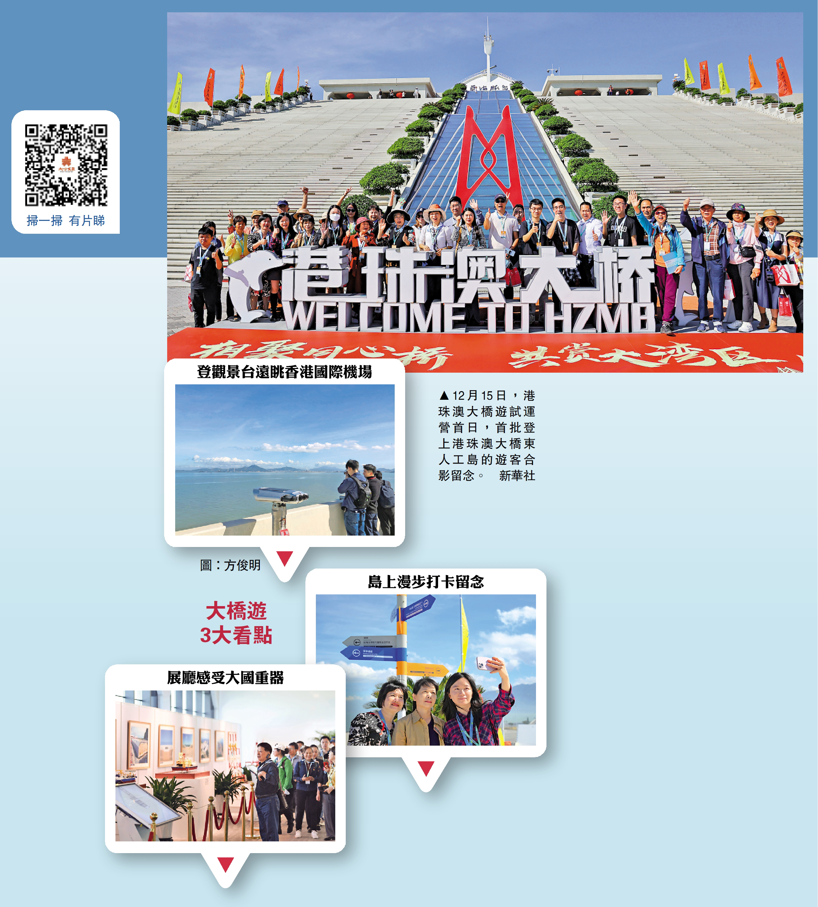 「早就想上橋登島,近距離地欣賞港珠澳大橋的風景。」港人阿志告訴記者,他已經預訂了聖誕節前一天的大橋遊車票,計劃帶上小孩遊覽大橋後,順便來個珠海遊。他坦言:「目前大橋遊仍只能從珠海口岸出發,期待加快可從香港口岸出發。另外,粵港澳三地還要加快想辦法用好大橋,譬如可開發更多配套的大橋遊研學產品,讓更多港澳學生真正了解大橋建設、工藝以及其帶來的技術創新突破。」