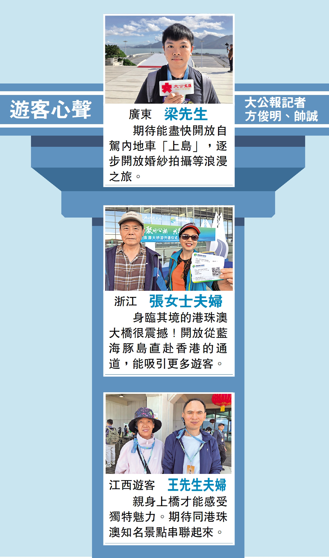 「百聞不如一見。藍海豚島上設置的港珠澳大橋展廳生動呈現『大國工匠』的建橋智慧。」廣州遊客梁先生期待未來能盡快開放自駕內地車「上島」,逐步開放婚紗照拍攝,開啟浪漫之旅。