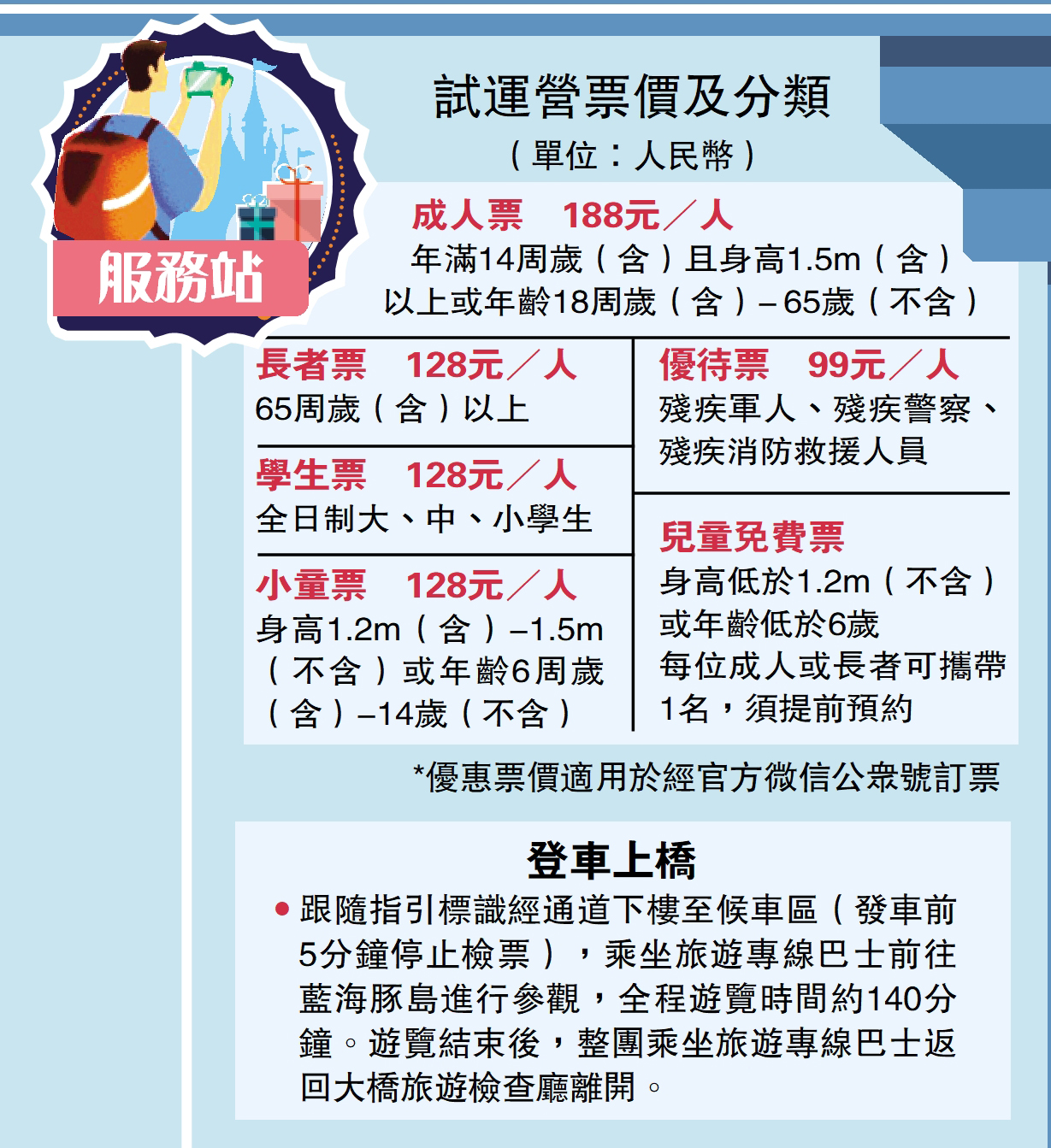 「青少年學生族、銀髮族以及情侶群體,可望成為港珠澳大橋遊組團主力軍。」珠海陽光國際旅行社有關負責人透露,青少年學生以研學為主打,銀髮族多為休閒「圓夢」之旅,情侶群體則主要奔着偶遇白海豚的浪漫之旅。目前珠海市政府正致力將港珠澳大橋遊打造成為品牌項目,拓展大橋「科普教育、愛國主義教育」功能。