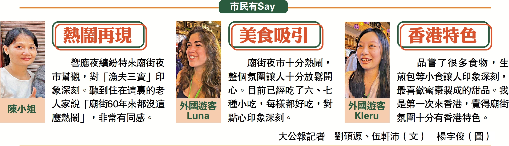 市民楊小姐昨日下午就開始在夜市外圍拍照打卡,她說以往逛廟街是買衣服或小飾品,認為夜市小攤新奇貼地,「氣氛很不錯,打算『掃街式』品嘗美食!」她預期在夜市花費300元,一邊吃,一邊感受夜繽紛的氣氛。亦有市民大讚夜市氣氛熱鬧,希望可以「玩夜啲」,營運延長至午夜12時。