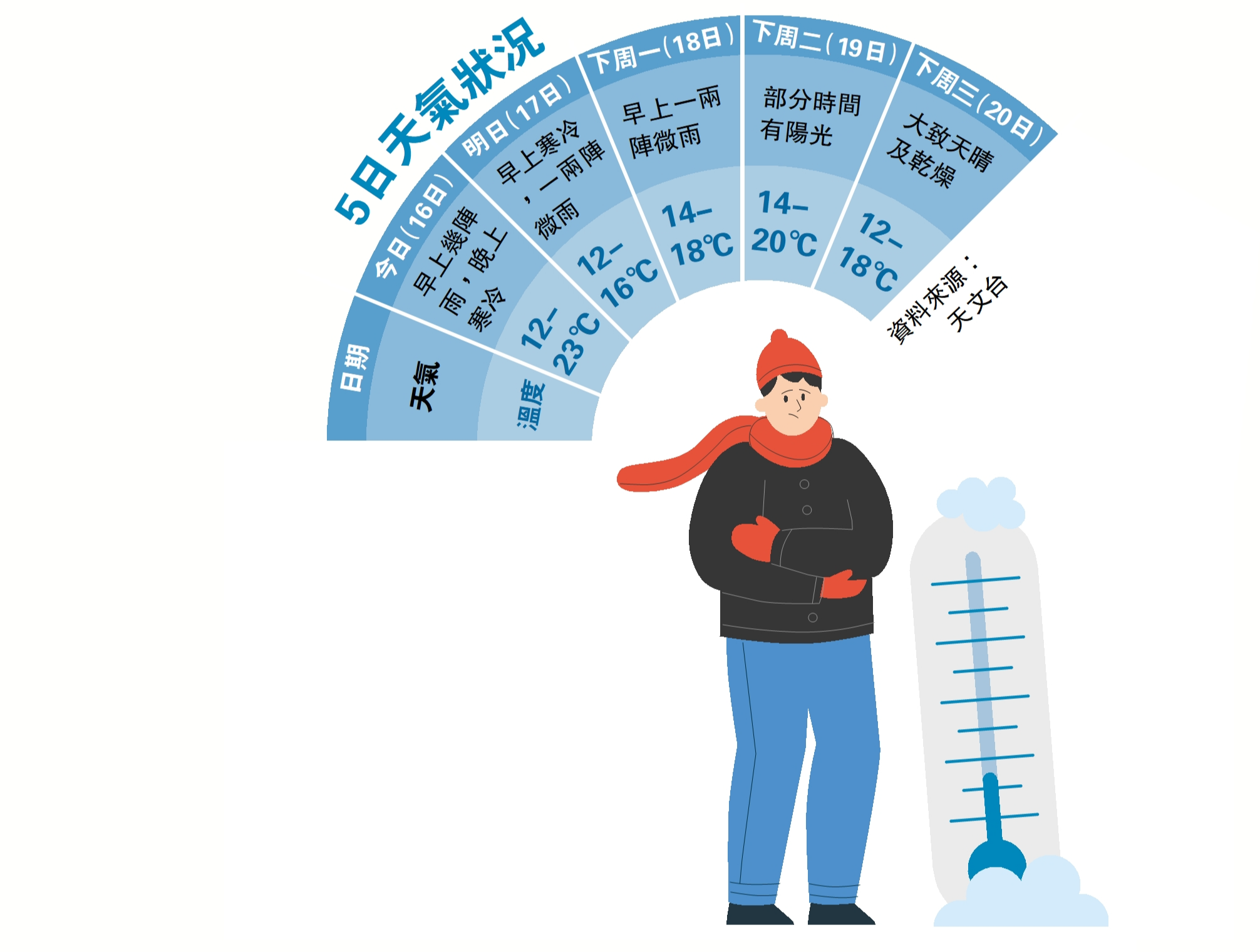 (大公報 記者 賴振雄)冷鋒到!天文台昨日預告,今日天氣顯著轉冷,並有幾陣雨,今早將發出今年入冬以來首個寒冷天氣警告,今晚市區最低氣溫跌至12℃,新界再低幾度。