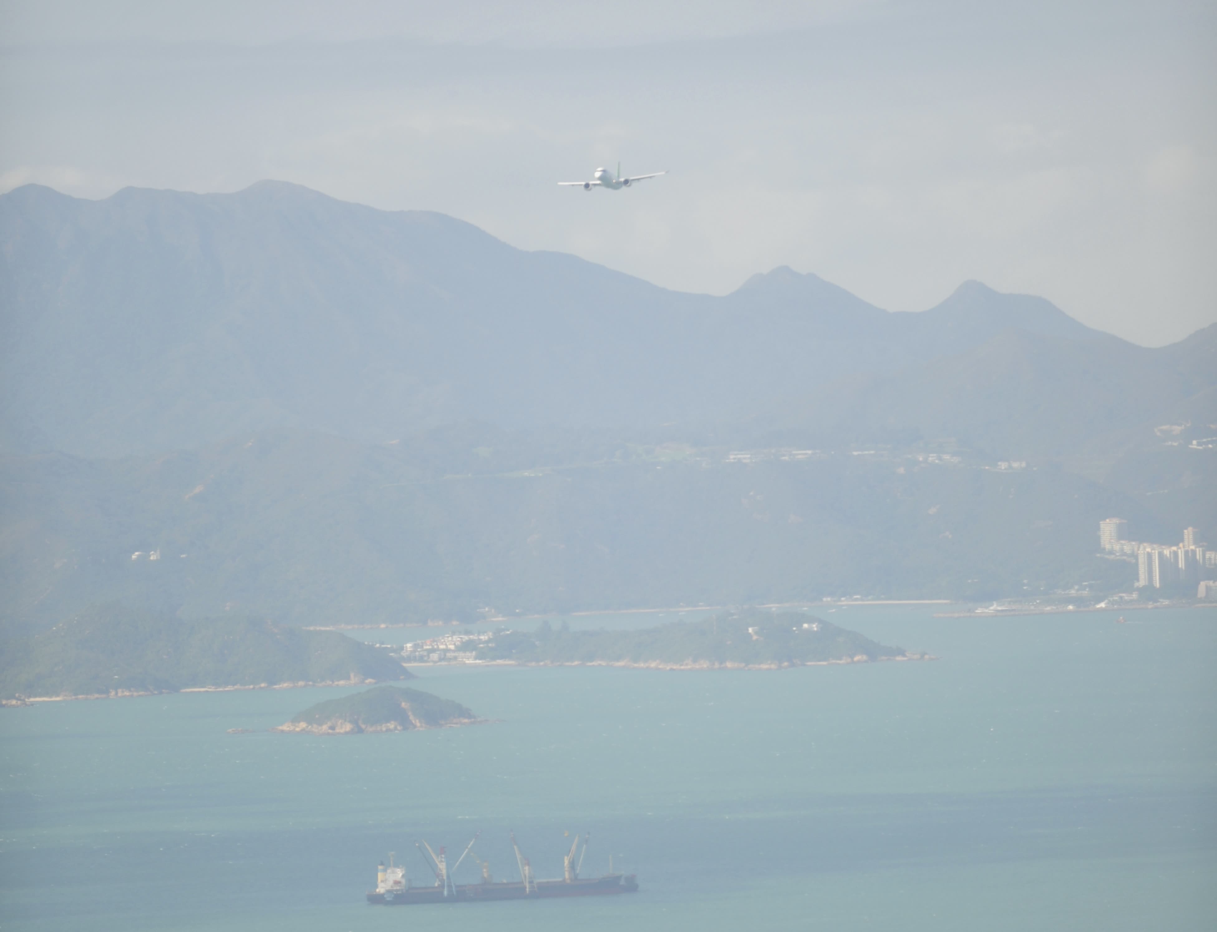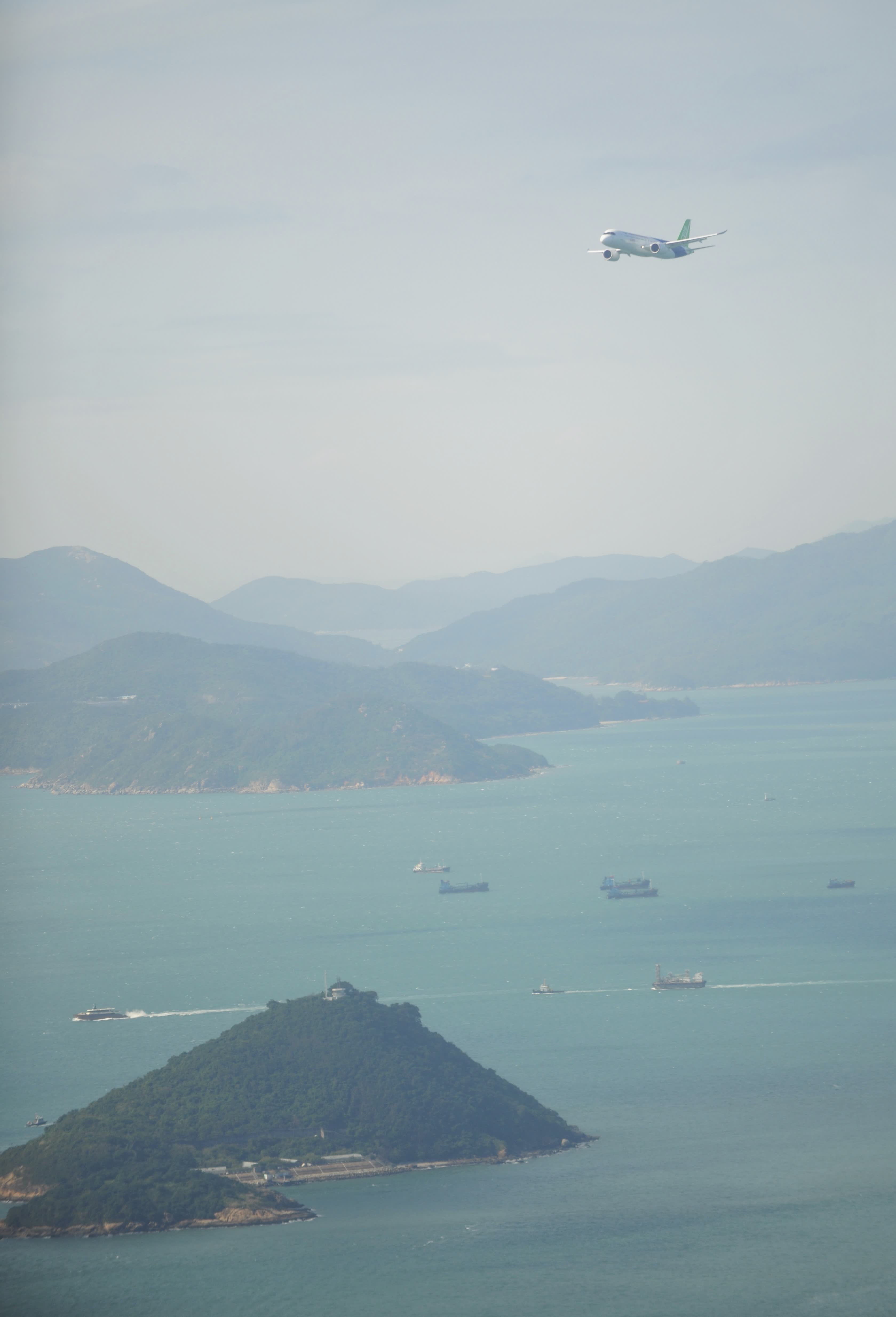 10時50分左右,隨着同行的一句,「你看那個飛機是不是?」大家看到了飛機。起初很小,隨着飛過大嶼山區的山與海,飛過坪洲,機型逐漸清晰。記者們霎時間很安靜,呼吸都顧不上,只聽到瘋狂點按快門的聲音。飛行第一遍時的小遺憾在於,1500呎的高度讓飛機身型看起來有些「嬌小」,好在各位記者已經理清楚了飛行的時間和路徑,心中有了數。大公文匯全媒體記者趁空檔時間,馬上挑選視頻和照片發給後方同事。