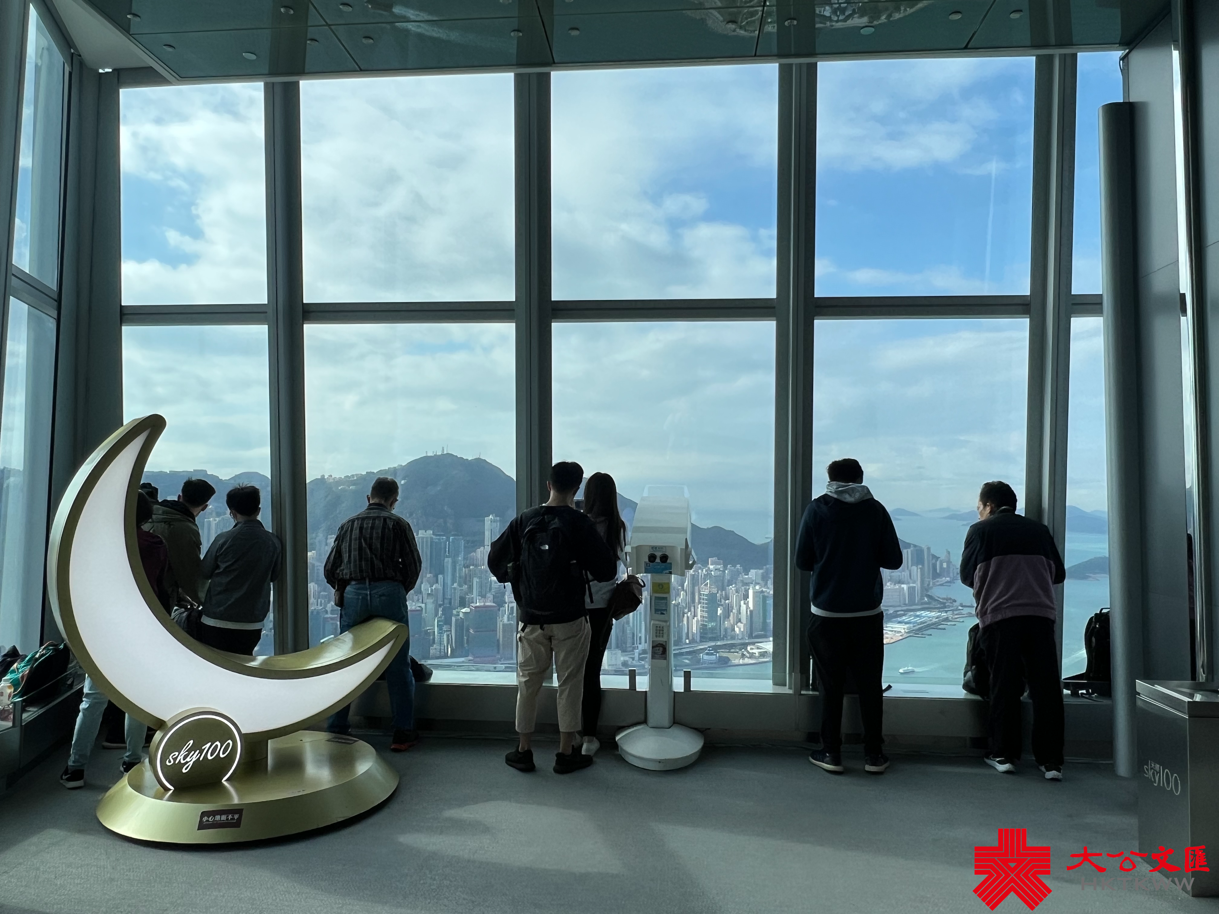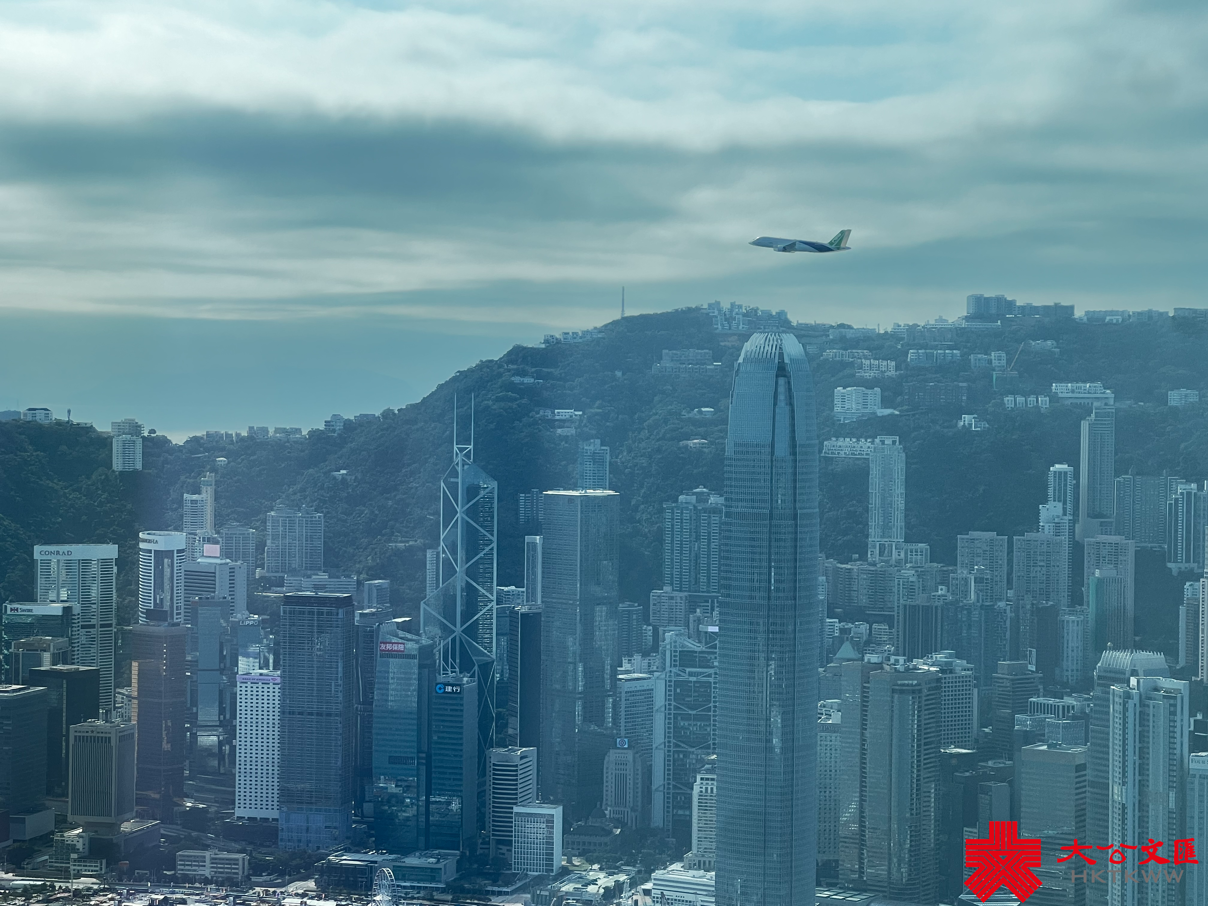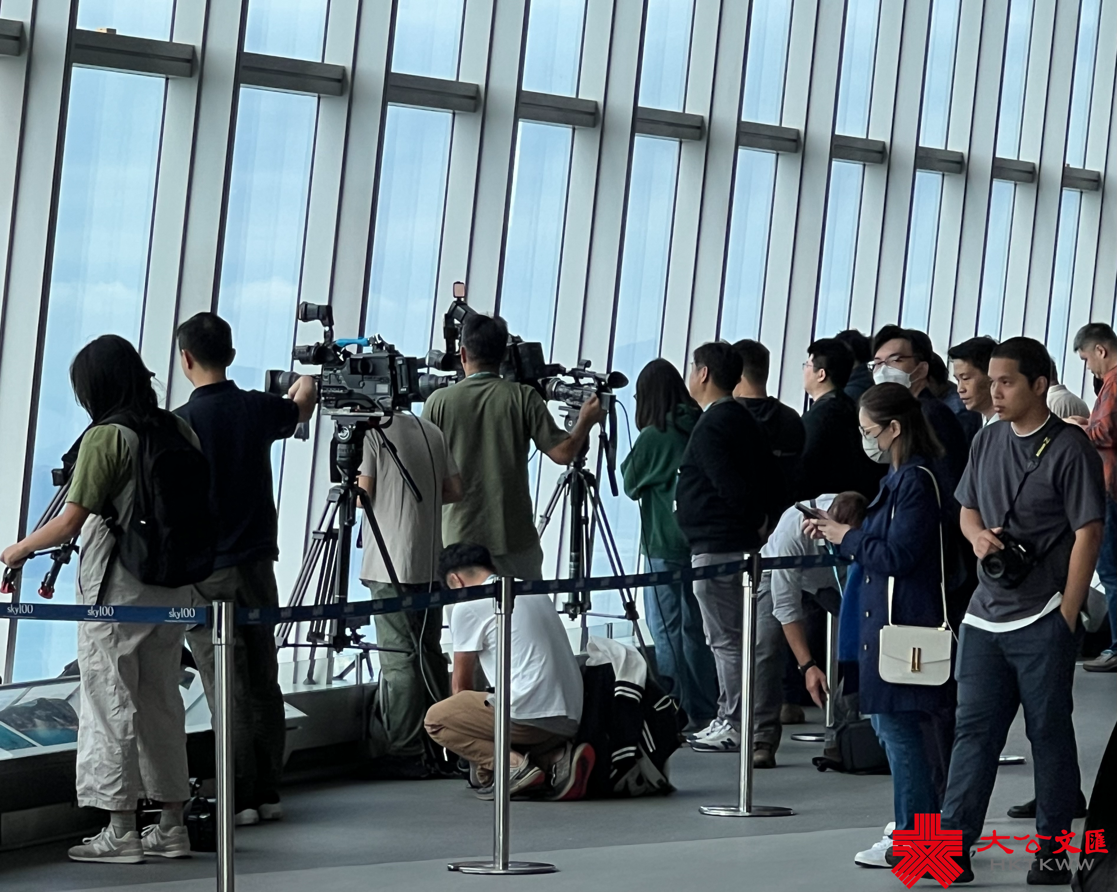 大公文匯全媒體記者幸運收到「天際100」邀請,無視野盲區進行觀賞拍攝,一同前來的還有各家媒體近30位記者。9時45分,大公文匯全媒體記者搭乘電梯來到100樓,十多秒鐘,就站在了393米高空。當時距離飛機起飛還有45分鐘,但記者們毫不無聊,一個個來回走動,尋找有利方位,架設三腳架,擺試相機。估計記者們的心理是:畢竟是第一次飛行表演,對飛機劃過的時間和方位,都沒有完全清晰的認知,生怕百密一疏,拍不到好畫面。大公文匯全媒體記者分別佔據了兩處不同方位,一處拍飛機來時的路,一處拍飛機飛過IFC、中銀大廈、金紫荊廣場等標誌性建築物的場景。