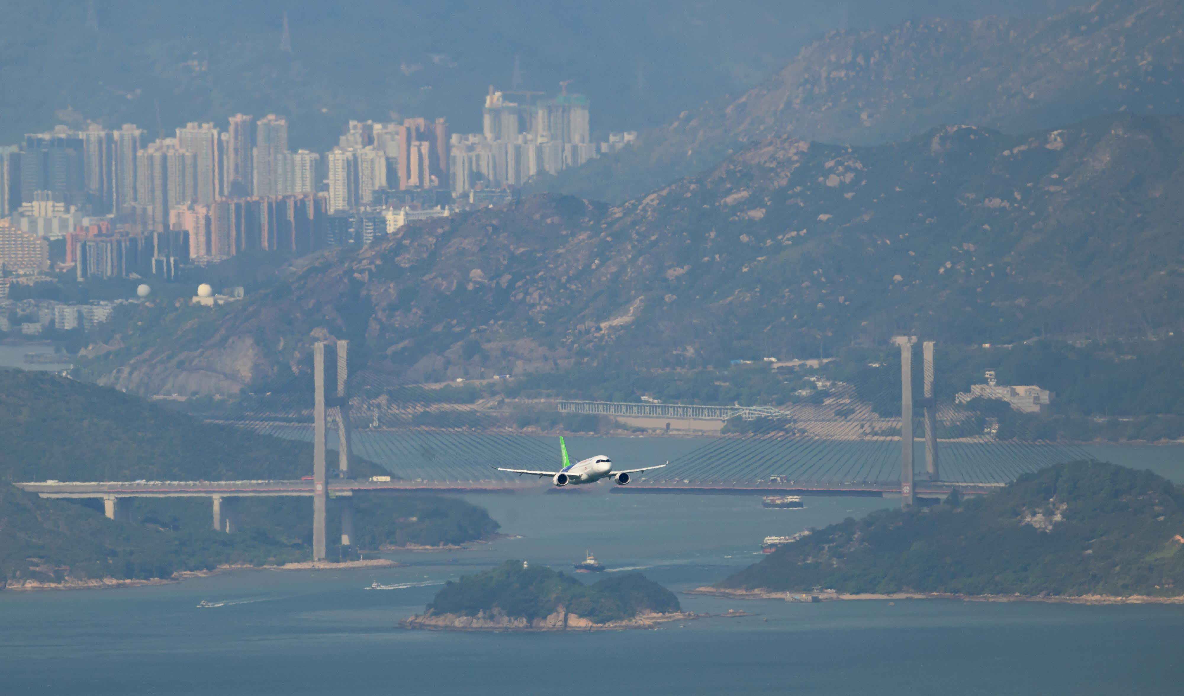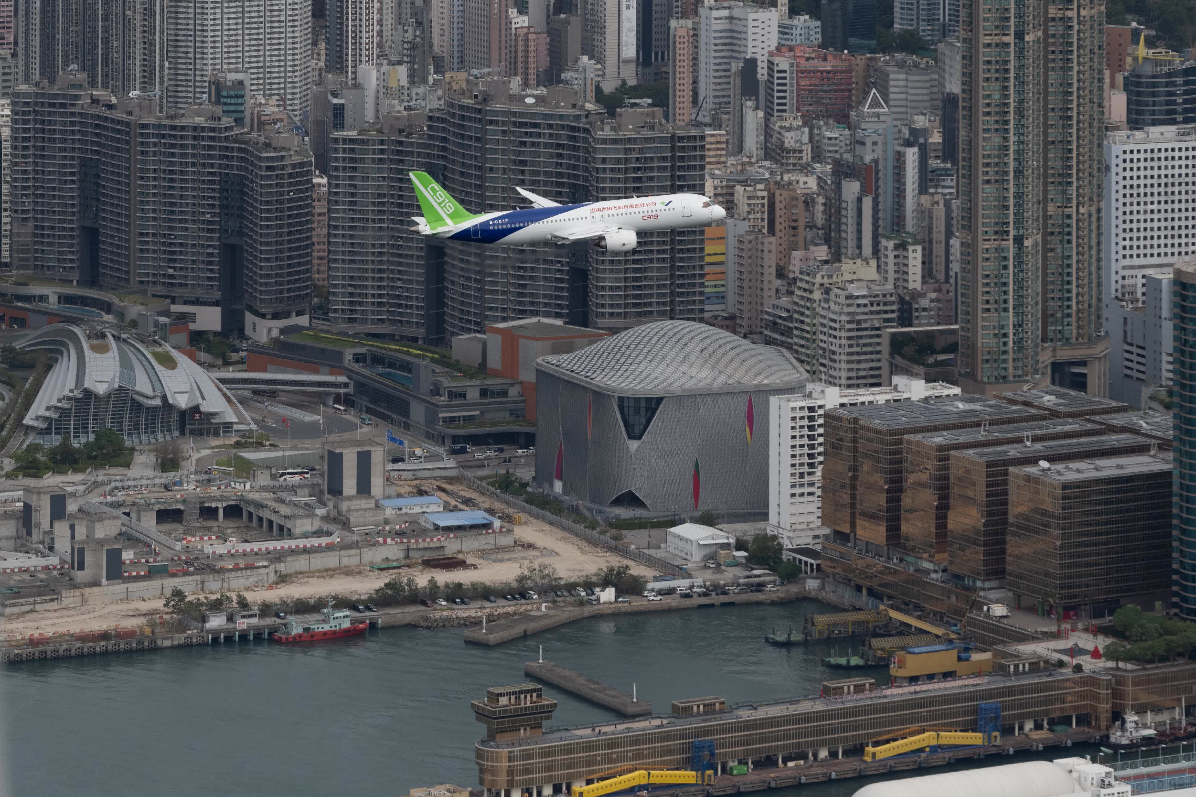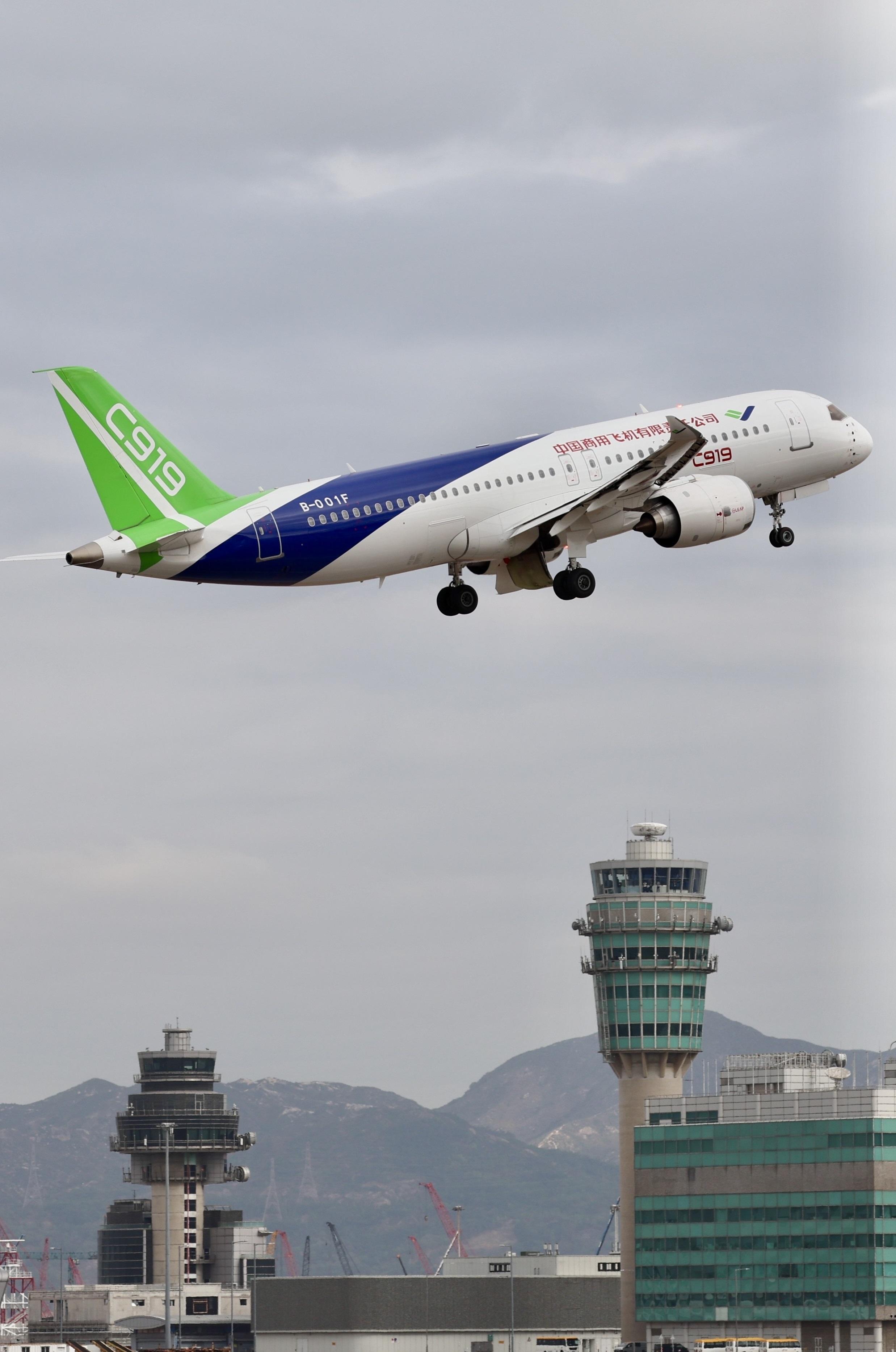 C919飛機於今早十時二十六分由香港國際機場南跑道起飛,自西至東進入並飛越維多利亞港兩次,飛行高度分別為1,500呎及1,000呎。飛機最後於十一時三十三分在南跑道降落。