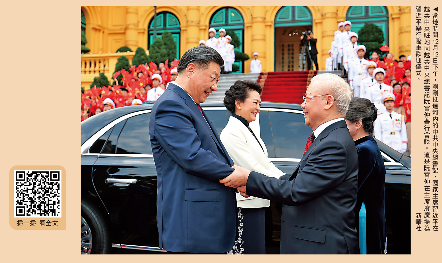 大公報援引新華社報道,新華社15日播發題為《攜手奔赴中越命運共同體的美好明天─中共中央總書記、國家主席習近平越南之行紀實》的文章。文章節錄如下: