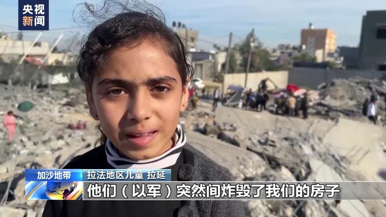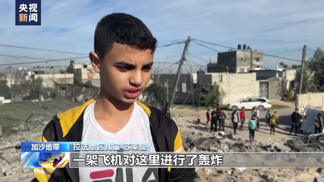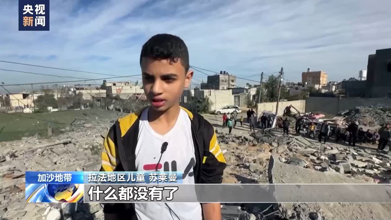 拉法地區兒童 蘇萊曼:晚上我們正在睡覺的時候,一架飛機對這裏進行了轟炸,當時就像地震了一樣。你可以看到這裏被破壞的程度,很多房屋都被摧毀了。看看那裏,這裏的人究竟做錯了什麼,要承受這一切。