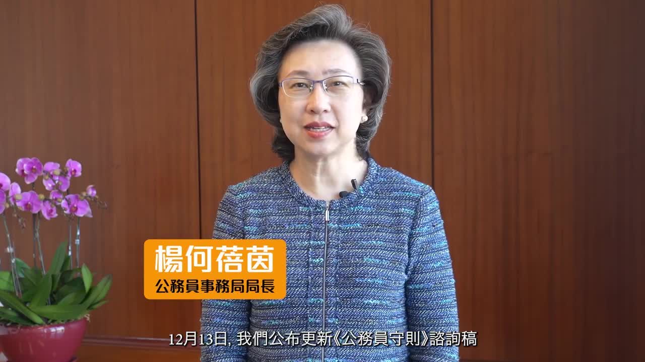 楊何蓓茵續指,更新《守則》諮詢稿當中的不少內容,其實是一直存在的。今次經過有系統的整合,旨在構建一套清晰、完整、合宜的基本信念和操守準則,作為公務員的行為指南。希望更新版《守則》令全體公務員更清楚了解自己的角色和責任,並以同一套目標和價值觀,服務香港社會和配合國家的發展策略。