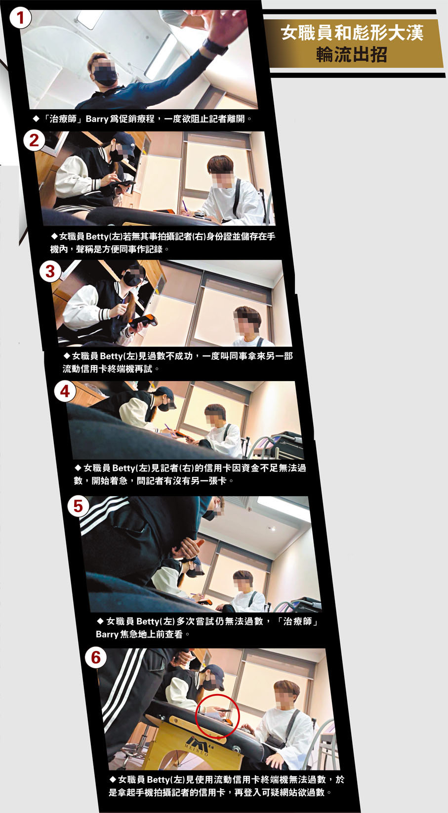 此時,本來站在Betty身旁的「治療師」Barry馬上站到治療房的門口,用身體阻擋玻璃門,並用右手臂按在門柄上,疑似想阻止記者離開。記者與他們來回拉鋸逾一小時後,便佯裝妥協以逾3萬元購買療程,Betty即時轉身到門外取出一部流動信用卡終端機(POS)和一份合約,邊催促記者盡快填寫合約內容,邊要求記者交出信用卡和身份證。