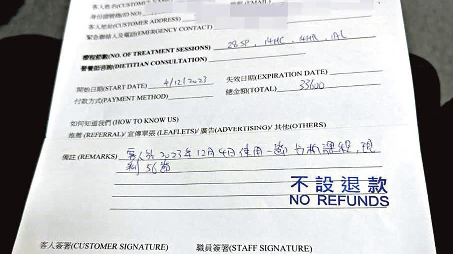 記者以為能脫身之際,原本在治療房門口的「治療師」Barry殺氣騰騰走近說:「嗱,咁啦! 你身上有幾多錢? 」記者說沒帶太多現金在身,Barry目露兇光說:「你剛才買的療程是3.36萬元,你𠵱家至少要畀3,300元先走得,尾數回家再影信用卡畀我哋碌。」記者聽罷,推說身上沒有3,000多元現金,對方繼續死纏說:「2,000蚊有啩?1,000蚊呢? 」見記者再三擰頭,他仍死心不息,「500(元)你有啦?𠵱家畀500蚊,之後尾數在信用卡扣。」