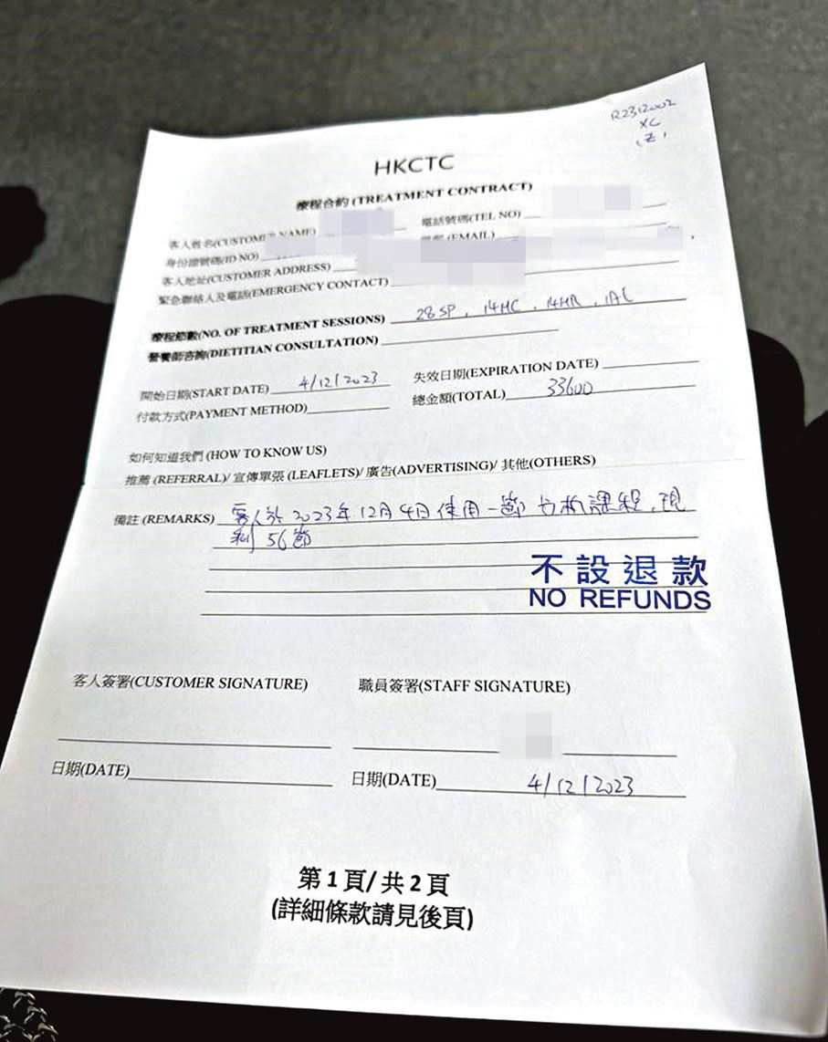 涉事的「痛症中心」開業一年多,經常大灑金錢在社交媒體賣廣告,但隨着投訴人數愈來愈多,該中心一年內數度將社交媒體的賬號改完又改。在香港文匯報記者成功「放蛇」後不久,該中心又將HKCTC品牌改名,但營業地址和社交平台賬號卻無變,繼續處理痛症求助。記者發現,HKCTC並非公司名,而是品牌名,法律上品牌名不是「法人」,必須由持有該品牌的公司與客人簽約才有法律效力。而記者翻查多名苦主的服務合約,都是以HKCTC、已過時的平台賬號名義與苦主簽訂合約,換言之有關合約沒有法律效力,苦主也無法向一個品牌作出訴訟,淪為無頭公案。