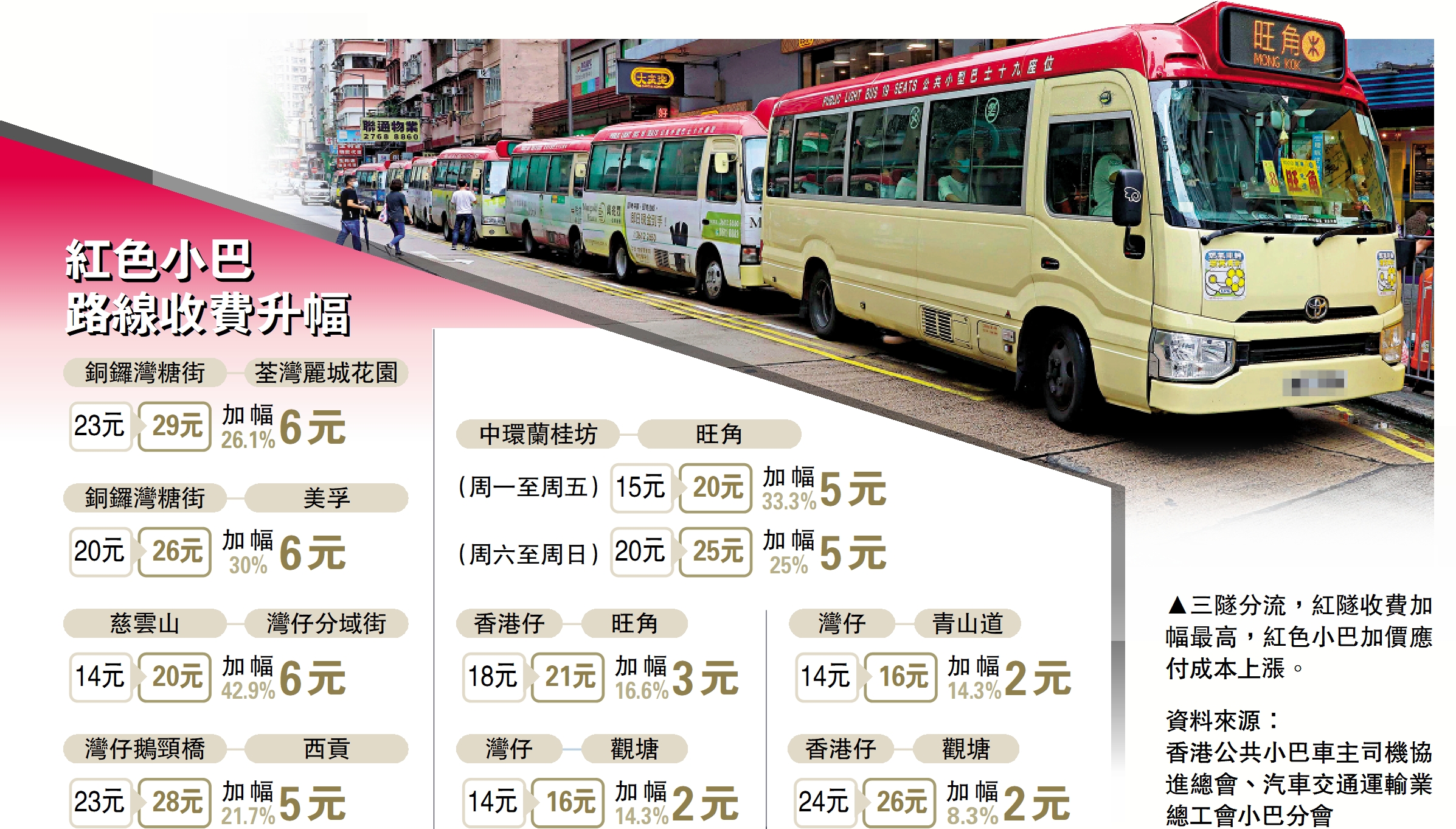 (大公報 記者 鍾佩欣)三隧昨日起實施分時段收費,八條經紅隧行駛的紅色公共小巴隨即加價,其中一段灣仔往返慈雲山線路加幅高達43%,一程收費20元,其次為銅鑼灣往返荃灣西路線收費29元,加幅為26%,有乘客坦言會考慮轉乘其他交通工具。