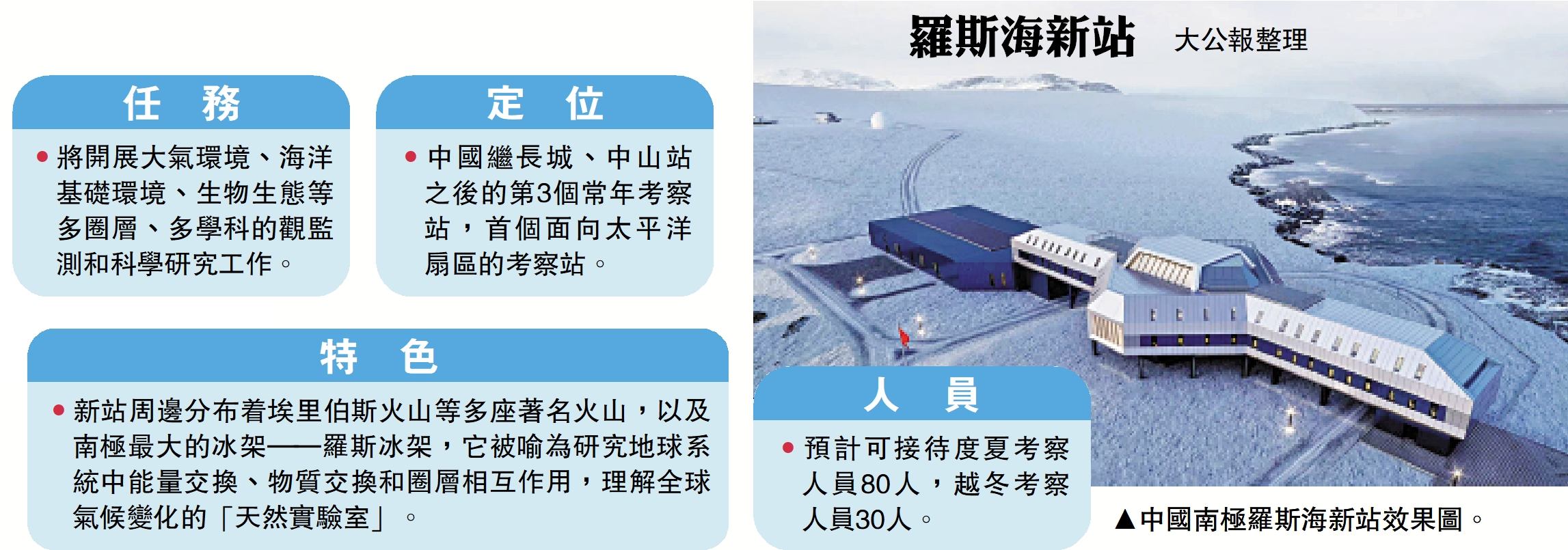 羅斯海新站位於南極羅斯海海域的恩克斯堡島,是繼長城站、中山站之後第3個常年考察站,是中國在南極的第5個考察站,也是首個面向太平洋扇區的考察站。新站建成之後,預計可接待度夏考察人員80人,越冬考察人員30人。