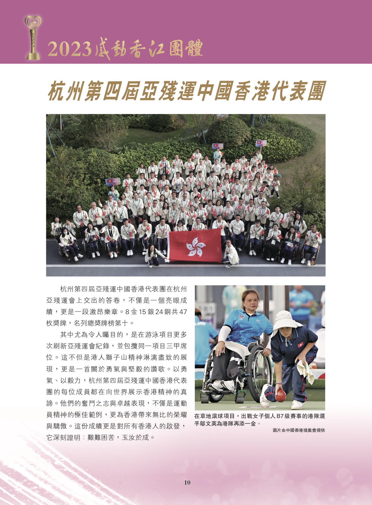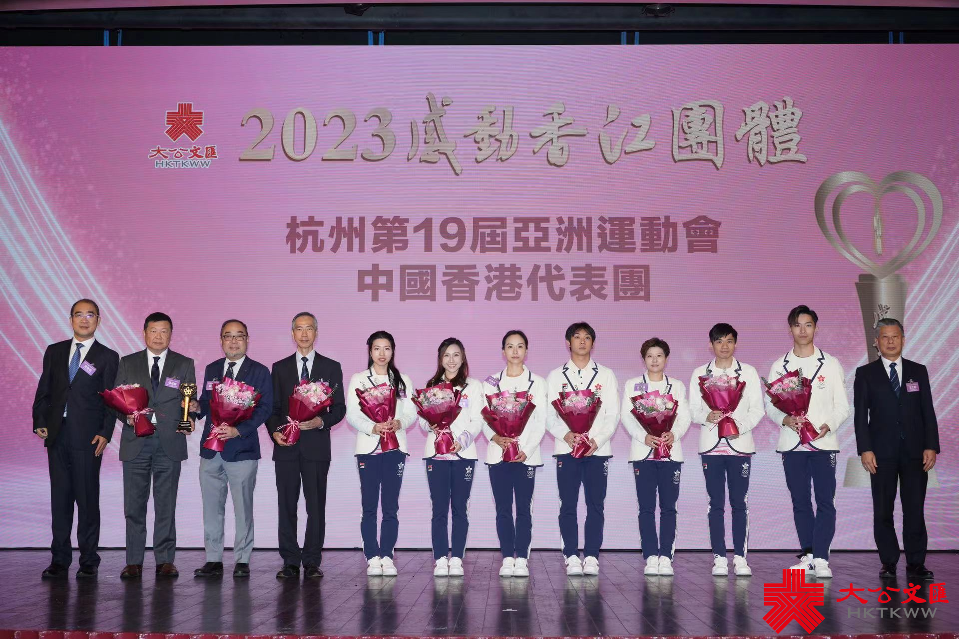 3個「2023感動香江團體」分別是:杭州第19屆亞洲運動會中國香港代表團,在杭州亞運會上,中國香港代表團奪得8金16銀29銅共53面獎牌,是中國香港代表團史上最佳成績。這是體育競技的勝利,更是中國香港代表團意志的勝利;杭州第4屆亞洲殘疾人運動會中國香港代表團,杭州第四屆亞殘運中國香港代表團在亞殘運會上交出的答卷,不僅是一份亮眼的成績單,更是一段激昂的樂章。8金15銀24銅共47枚獎牌,名列總獎牌榜第十;郊野義務搜索隊,今年10月,拔萃男書院學生曾憲哲在郊野失蹤,郊野義務搜索隊協助搜救,期間更經歷了九號風球和黑色暴雨等極端天氣,最終學生成功獲救,他們不計回報地拯救生命,為一個個無助的家庭帶來希望。