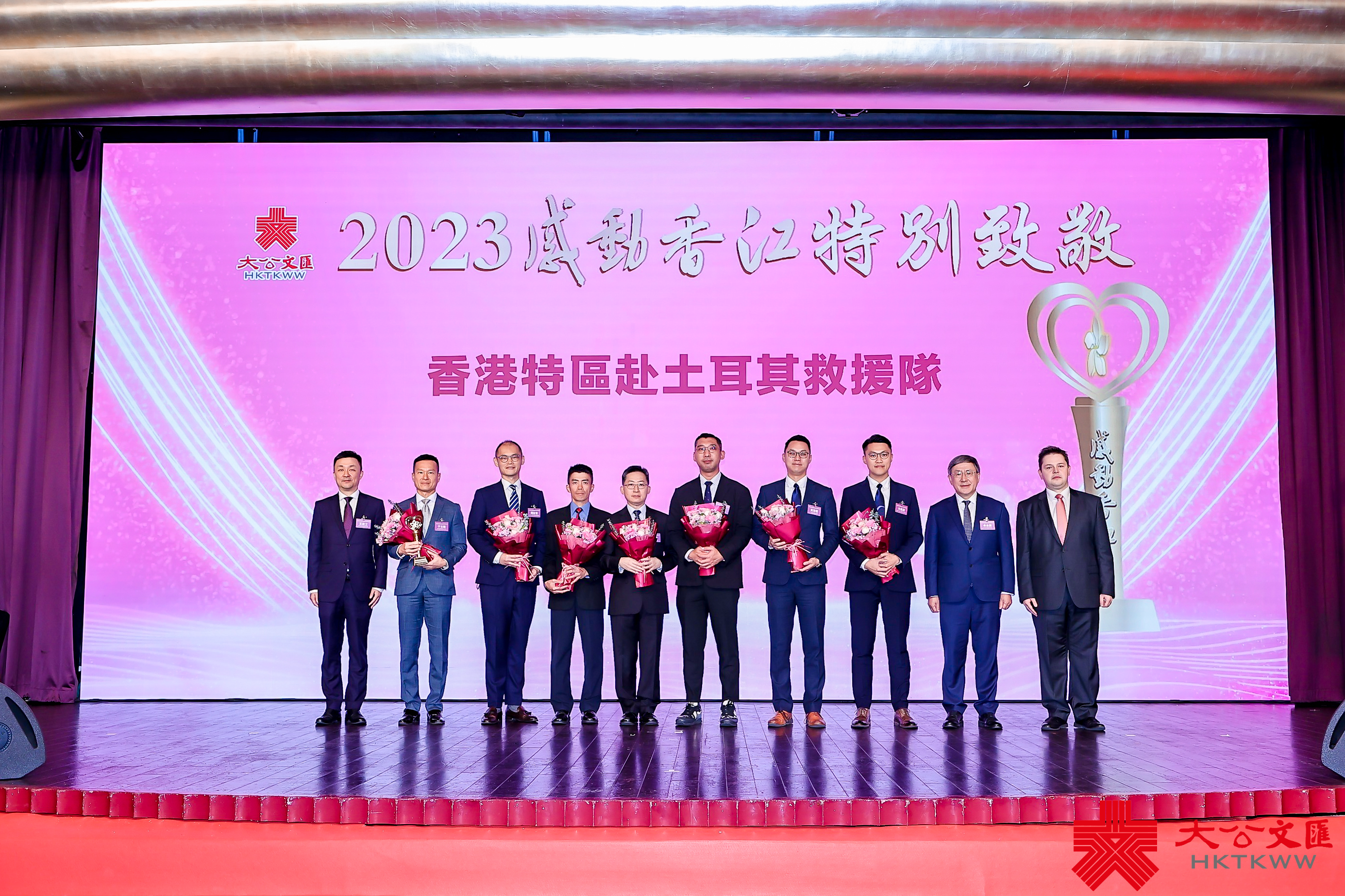 此外,香港特區赴土耳其救援隊獲頒發「2023感動香江特別致敬」獎。今年2月,土耳其和敘利亞接壤地區發生強烈大地震,香港特區政府組成59人的救援隊飛赴災區奮戰逾200小時,在強震後的一周奇跡般地救出4名倖存者,並挖掘出6具遇難者遺體。他們迎難而上,爭分奪秒,不放過任何拯救生命的機會,充分展現了救災無分國界的互助精神,展示了香港特區政府公務員團隊的優秀能力,是國家和香港的驕傲。