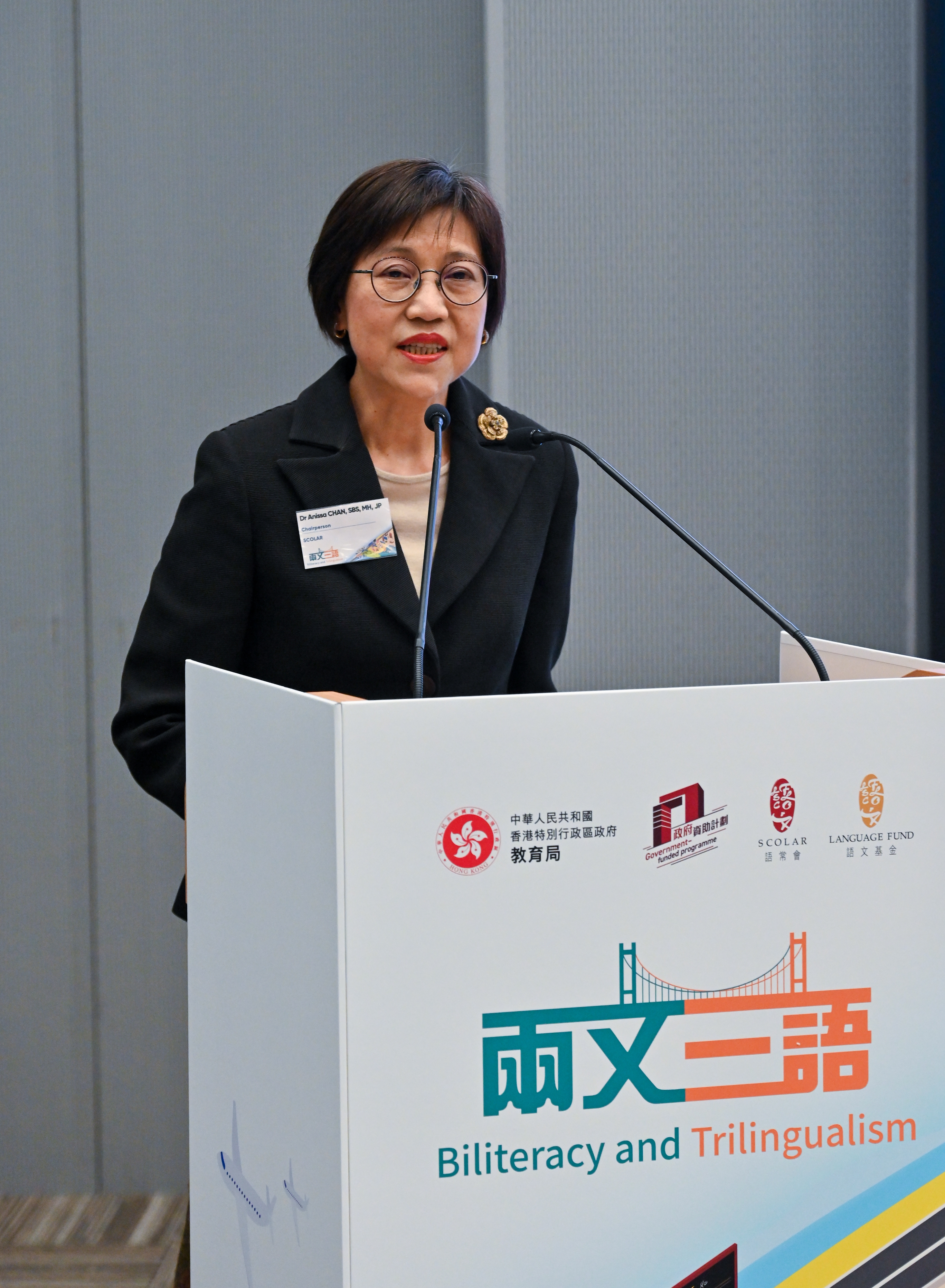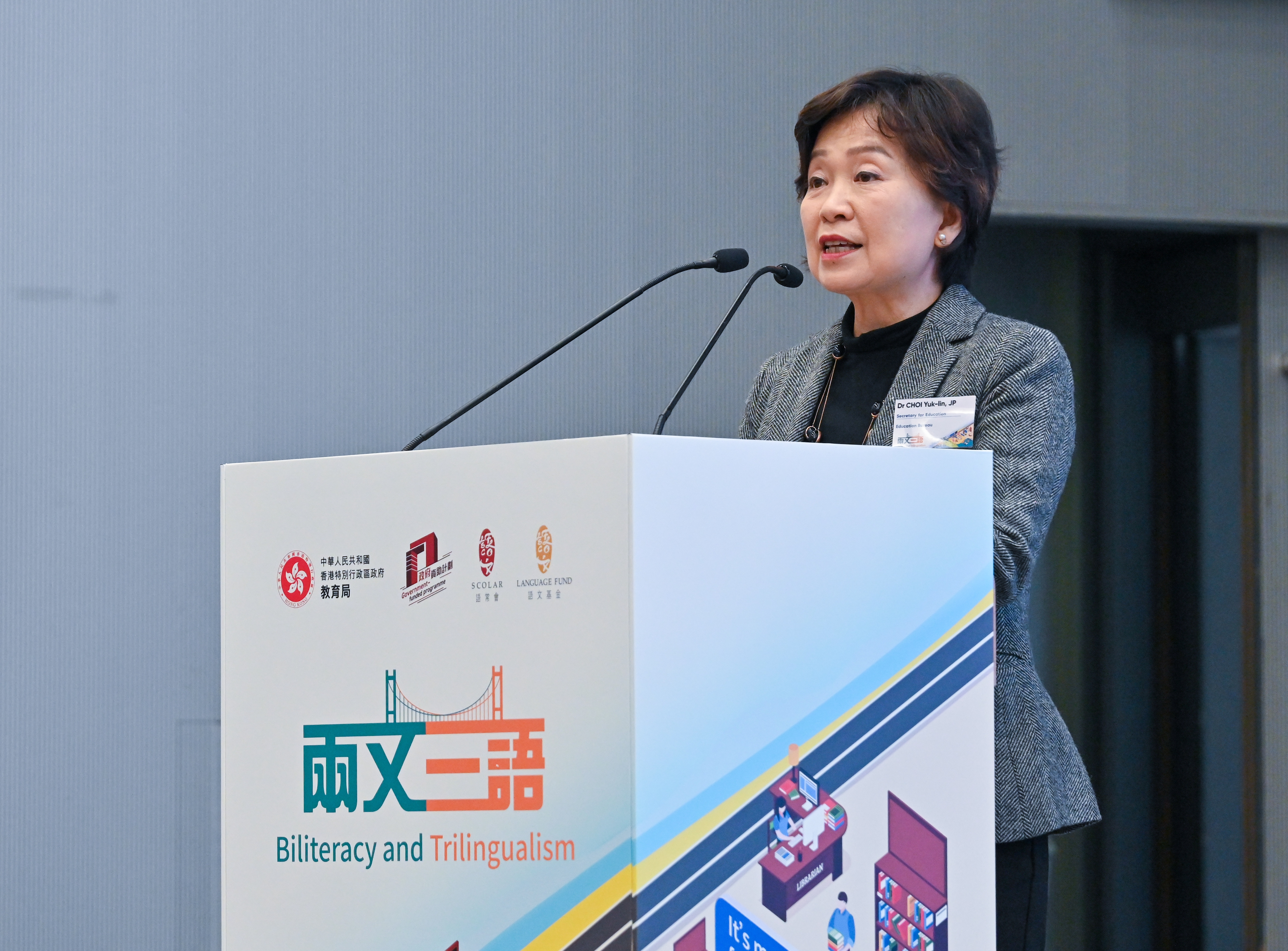 蔡若蓮致辭時表示,特區政府努力通過不同人才計劃,吸引全世界人才和資金到香港升學、就業和投資,增強香港的發展動能。香港作為國際人才匯聚的城市,社會兩文三語的能力,不單有助增強香港經濟的競爭力,更能促進多元文化的理解共融。她說,從小培養學生兩文三語能力是教育目標,教育局為學校和老師提供一系列資源、支援和培訓。她指語常會與不同持份者舉辦及支持各類推廣兩文三語的活動,並盼望大家同心協力,共同推進「兩文三語運動」,增加香港的語言資本,展現多元文化共融國際大都會的地位和魅力。