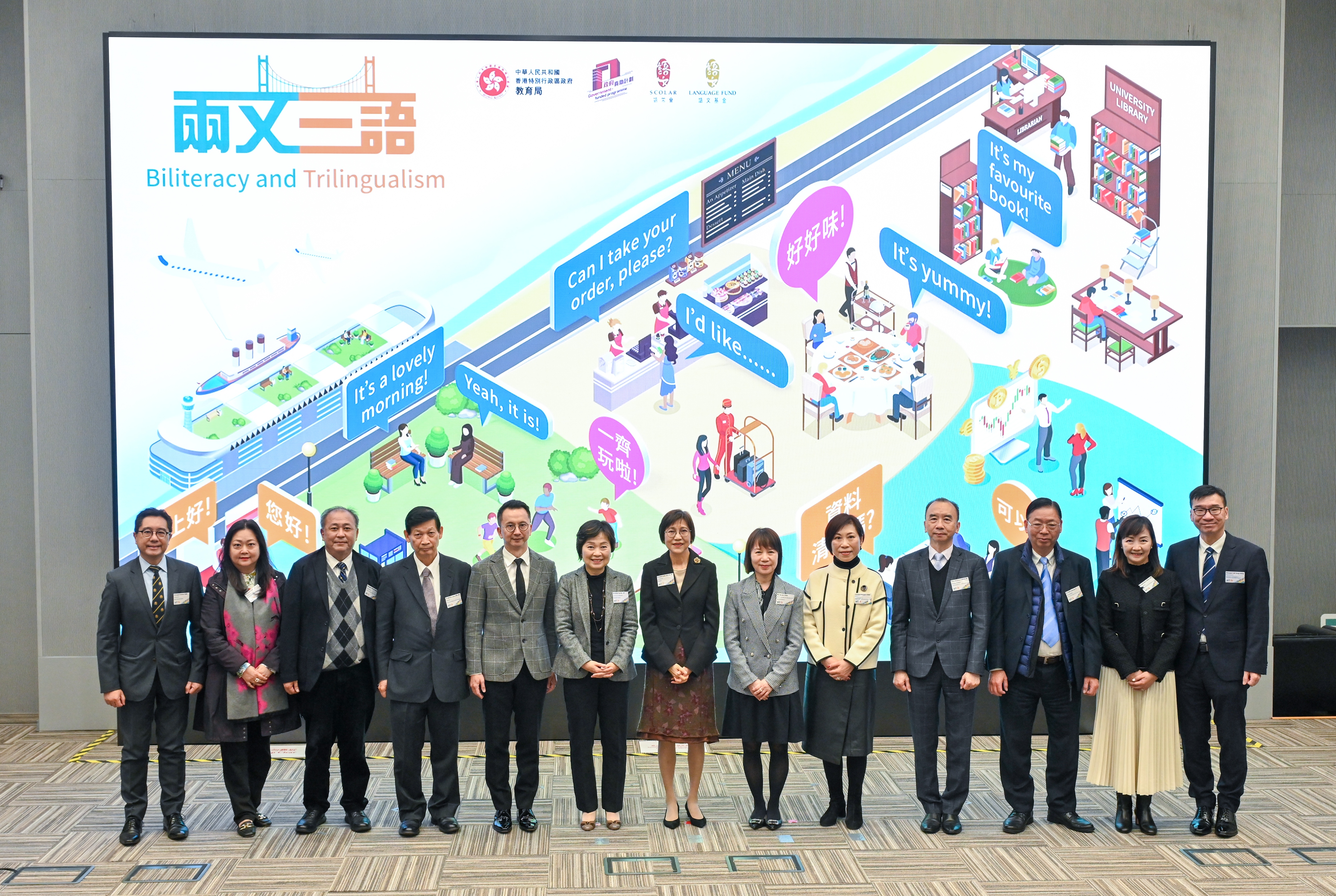 大公文匯全媒體報道,教育局和語文教育及研究常務委員會今日(19日)舉行「兩文三語運動」啟動禮,為期五個月的一系列活動揭開序幕。為響應兩文三語的主題,三位主禮嘉賓政務司司長陳國基、教育局局長蔡若蓮和語常會主席陳黃麗娟分別以廣東話、普通話及英語致辭。