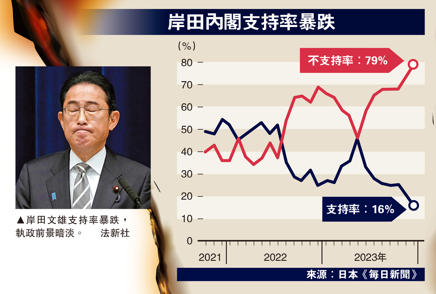 岸田文雄18日就自民黨黑金醜聞向日本國民表示歉意,並表示將採取「建立新框架」等措施,但並未提及設立時間和具體內容。共同社的最新民調顯示,多達44.5%的日本民眾希望岸田盡快辭職,其執政前景堪憂。《每日新聞》最新民調顯示,岸田內閣支持率已跌至16%,再創新低。