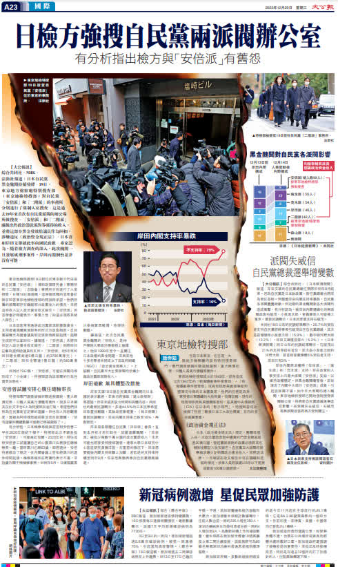 大公報綜合共同社、NHK、法新社報道:日本自民黨黑金醜聞持續發酵。19日,東京地方檢察廳特別搜查部(東京地檢特搜部)對自民黨「安倍派」和「二階派」的事務所分別進行了強制入室搜查。這是過去19年來首次有自民黨派閥的辦公場所被搜查。「安倍派」和「二階派」瞞報出售政治籌款派對券獲得的收入,並將這部分黑金發放給議員作為回扣,涉嫌違反《政治資金規正法》。日本首相岸田文雄就此事向國民致歉。專家認為,隨着檢方調查的深入,此次醜聞一旦發展成刑事案件,岸田內閣倒台並非沒有可能。