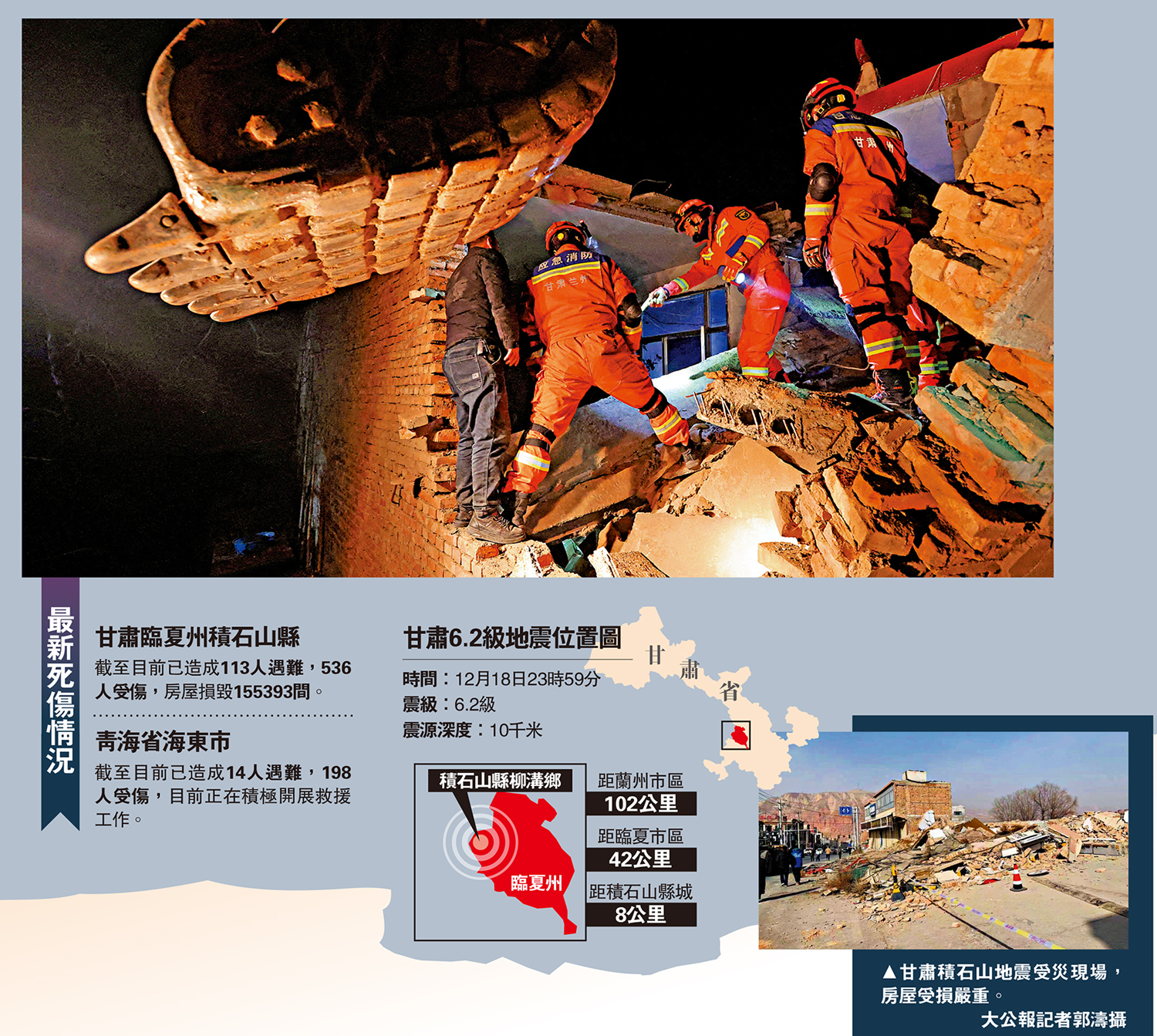 大公報綜合記者郭濤、新華社、中通社、澎湃新聞報道,12月18日23時59分,甘肅臨夏州積石山縣發生6.2級地震,震源深度10公里。強震之後,餘震不斷。截至19日16時,地震已造成甘肅113人遇難,536人受傷,房屋損毀155393間;造成與積石山縣相鄰的青海省海東市三個縣受災,14人遇難、198人受傷。災害發生後,國家多部門迅速啟動應急響應,增調中央救災物資,全力支持災區做好抗震救災工作。中國地震台網公布的此次地震餘震統計顯示,截至12月19日12時00分,共記錄到餘震306次,其中3.0級及以上9次,3.0級以下297次;目前最大餘震4.1級,距主震約14公里。