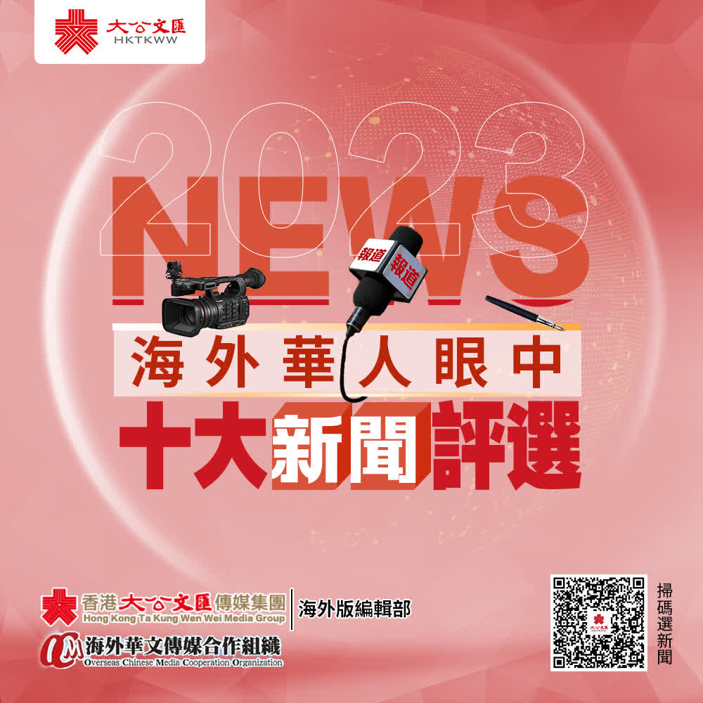 大公文匯網報道,2023年極不平凡,歲末回望,大事連連。由香港大公文匯傳媒集團海外版編輯部、海外華文傳媒合作組織共同舉辦的「2023海外華人眼中十大新聞評選」活動正在進行,歡迎大家票選自己心目中的年度十大中國新聞和十大國際新聞。
