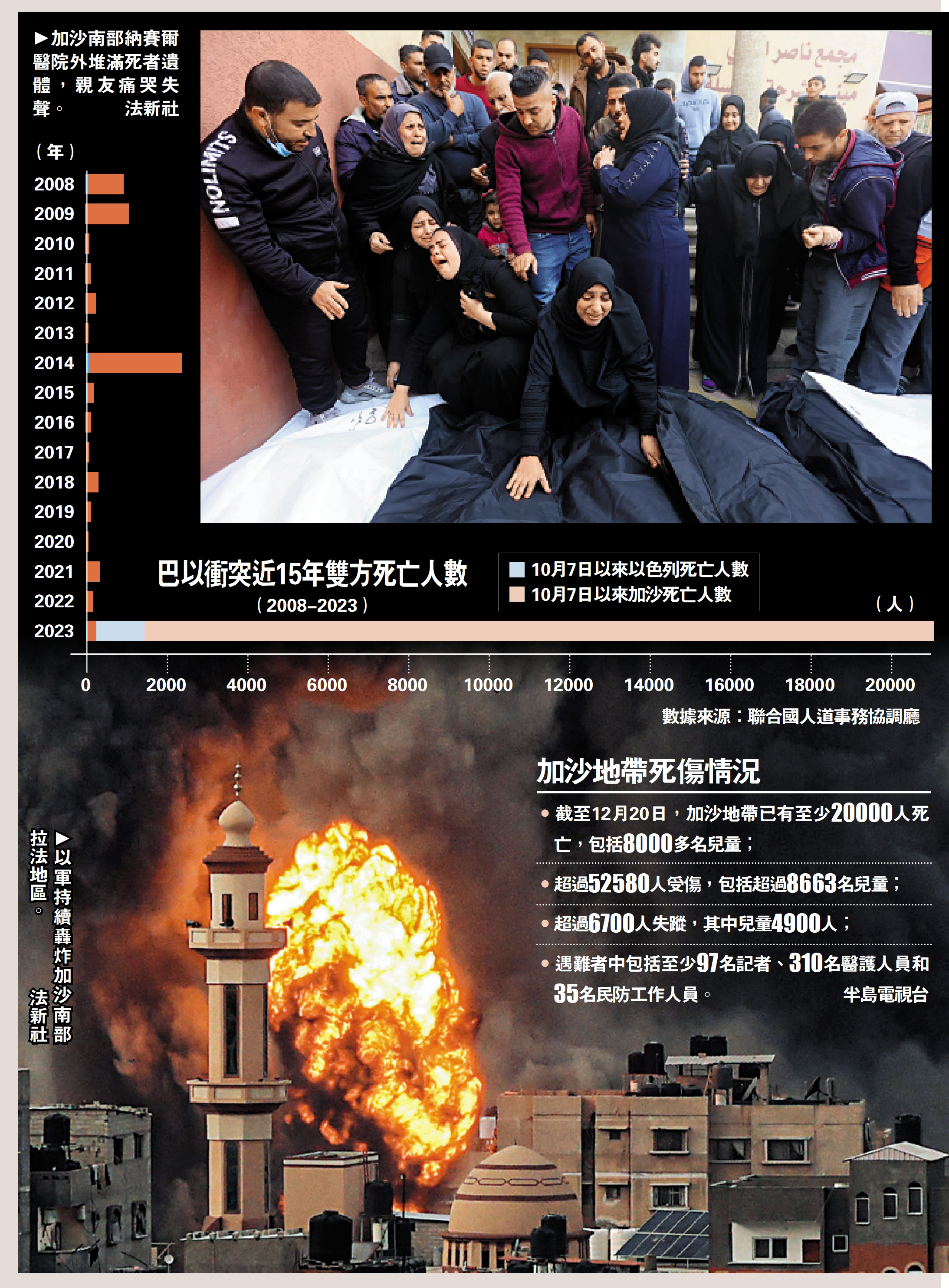 大公報綜合BBC、《衛報》、半島電視台報道:巴勒斯坦加沙衞生部門20日晚表示,巴以新一輪衝突爆發以來,以色列軍隊在加沙地帶的軍事行動造成至少2萬人死亡,包括超過8000名兒童、約6200名婦女和310名醫務人員。另有超過5.2萬人受傷,6700多人失蹤。BBC援引專門研究全球衝突的專家史帕蓋特教授稱,自2008年以來的一系列巴以衝突中,當前的戰爭無論在死亡人數還是在平民遭濫殺的程度上,都是史無前例的。