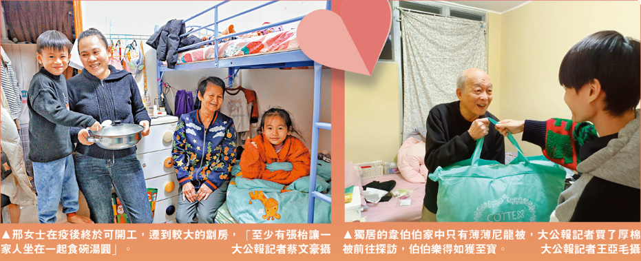 有劏房家庭隨着疫後社會復常,有了工作,今年冬至可以搬到大一點的劏房單位,準備一家吃湯圓,冬至願望是盡快上樓,真正一家團聚。有獨居長者住了七年床位,終於趕在冬至前兩周獲配公屋,擁有安樂窩,「冬至在家吃點麵條,也很幸福,因為終於有真正的家了。」
