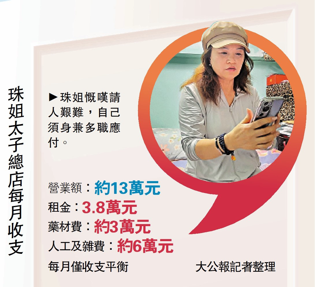 珠姐透露,現時經營涼茶舖的成本不斷上升,以太子總舖為例,每月租金約4萬元,購買藥材費用3萬多元,聘請員工及其他雜項支出近6萬元,「以前目標是每個月逾15萬營業額,但最近幾年每月僅能做到13萬左右的生意,僅夠維持開支,根本沒有錢賺。」