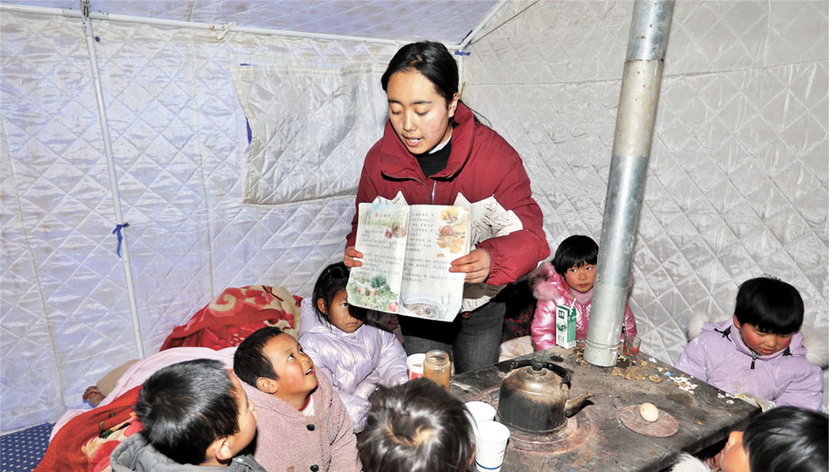 「一開始就是想災後把孩子們集中在一起看護,比較安全。同時讓孩子有事情做。唱歌、學習、玩遊戲,這就是課堂的內容。」張世晶說。每天早晨,張世晶早早地來到帳篷小學,她用心地準備每一堂課,用生動有趣的方式教授知識。除了教學,張世晶還組織了各種活動,讓孩子們度過愉快的時光。安置點的空地就是學校的操場,學習之餘張世晶就在這裏與孩子們玩遊戲,慢慢地,歡聲笑語充滿了這個小小的安置點。看着孩子們笑容滿面的樣子,村裏的大人們也都露出了微笑。他們感激張世晶對孩子們的關心和付出。