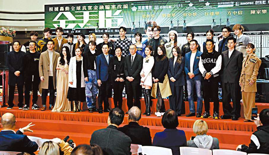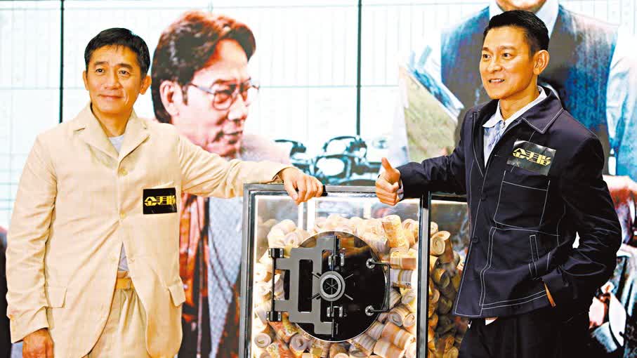 (香港文匯報 記者 阿祖 攝記 黃艾力)兩大影帝劉德華與梁朝偉《無間道》後相隔20年再度合作《金手指》,電影定檔12月30日全球同步開畫。前晚《金手指》首映禮暨英皇戲院Plus+(大圍圍方) 開幕典禮上,英皇集團主席楊受成博士與林建岳博士為戲院開幕擔任主禮嘉賓,至於《金手指》團隊包括導演莊文強、演員梁朝偉(偉仔)、劉德華(華仔)、蔡卓妍(阿Sa)、任達華(華哥)、方中信、陳家樂及錢嘉樂等均有上台分享拍攝感受,來捧場的嘉賓有保安局局長鄧炳強、張敬軒、沈震軒、溫碧霞及泳兒等,場面相當熱鬧,而華仔和偉仔的粉絲均不停尖叫為偶像打氣,兩位影帝也表現親民,不時向觀眾打招呼揮手。首映另一亮點是劉嘉玲前來撐老公梁朝偉,在偉仔與華仔在台上將大堆鈔票投入夾萬時,嘉玲更幫偉仔拍照。