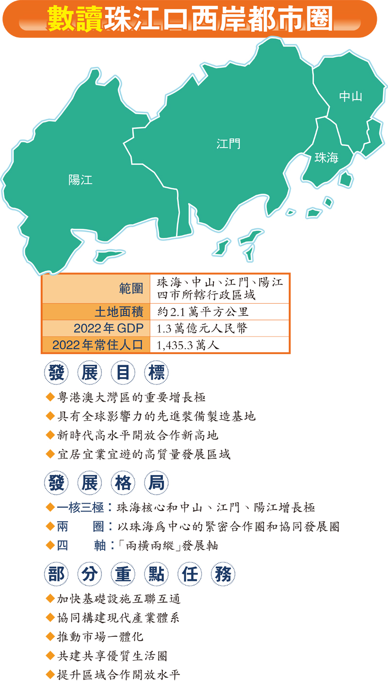 推動珠江口東西兩岸融合發展,是近年廣東工作的一個重點方向。香港文匯報記者從中山市政府獲悉,當地謀劃研究產業園共建共享機制,加快深中經濟合作區、香港—中山高質量發展合作區等平台建設進度。為進一步強化與深圳都市圈合作,中山將加快推進深中通道建設,規劃建設深中城際。同時,主動承接深圳製造業轉移和高端服務功能溢出,探索「東岸總部基地+西岸生產基地」「東岸研發+西岸孵化轉化」等協同發展模式等。江門近年提出並深入實施「僑都賦能」「港澳融合」工程,動工建設了全國首個RCEP經貿科技文化合作交流中心,創建了全國首個便利華僑華人投資稅收服務平台等,助力珠西都市圈加快打造新時代高水平開放合作新高地。