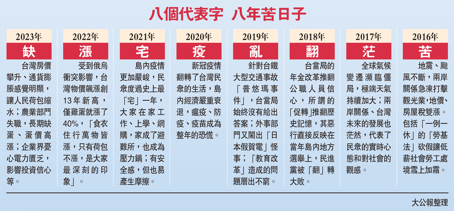大公報援引環球網報道,台灣年度代表字評選活動今年已邁入第16年,從2016年的「苦」到2017年的「茫」,以及接下來的「翻」「亂」「疫」「宅」「漲」,再到今年的「缺」,每個字都刻畫了當年島內的社會意向與民怨。這8個字沒有一個正面字眼,精準濃縮了蔡英文上台8年來的施政表現。島內輿論指出,民進黨執政快8年,在解決各種「缺」的問題上花了大把鈔票,如在水資源上投注了2507億元新台幣的天文數字,但今年水荒特別嚴重,各方才會質疑,錢用到哪裏去了?從年度字「缺」到現下幾乎什麼都「缺」,老百姓給民進黨的執政蓋棺論定是「天殘地缺」。