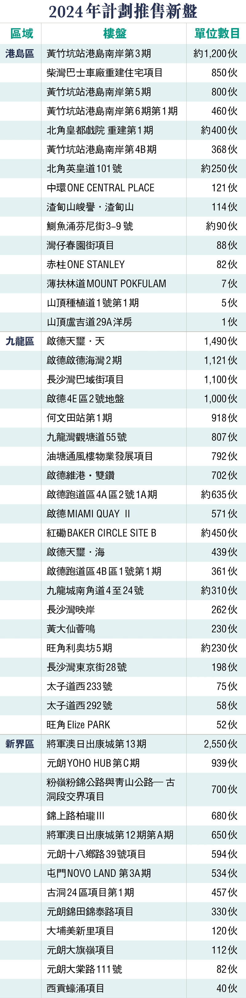 (香港文匯報 記者 梁悅琴)2024年美聯儲有機會減息,加上大批內地專才獲批來香港,本港失業率維持2.9%,無疑有利本港經濟發展及樓市氣氛,市場預計2024年一手市場供應將百花齊放。據發展商公布及業界推算,市場上至少有49個新盤項目部署於2024年推售,估計單位數目達24,425伙,近半數供應量集中於啟德區及「北部都會區」; 至於逾千伙大型新盤亦至少有6個。業界指出,本港經濟前景仍充滿挑戰,近兩年一手成交低迷,令一手貨尾積存量升到逾2萬伙,加上又有全新盤推出,相信部分一手供應充裕的地區,發展商為了追業績,開價仍會較克制,甚至會繼續推出優惠吸客,以刺激銷情。