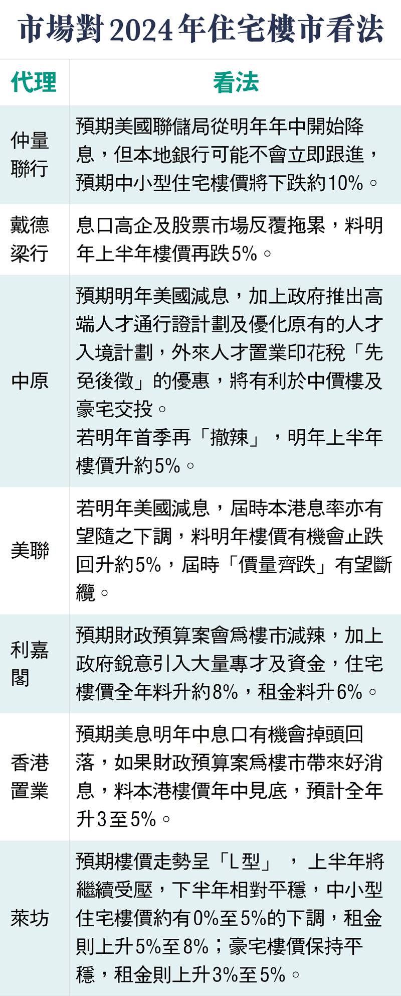 中原亞太區副主席兼住宅部總裁陳永傑表示,隨着美國最新一次議息再宣布維持息率不變,並表示明年減息三次共0.75厘,相信在利好消息刺激下,明年首季將現成交量「小陽春」,預計發展商仍會以低價推盤,貨尾盤亦會推出各項優惠吸客,預料明年一手市場可錄約1.5萬宗成交,按年升50%。由於政府着力搶人才,包括推出高端人才通行證計劃及優化原有的人才入境計劃,加上施政報告中「先免後徵」的優惠,將有利於中價樓及豪宅交投。若明年首季「撤辣」,上半年樓價升約5%。