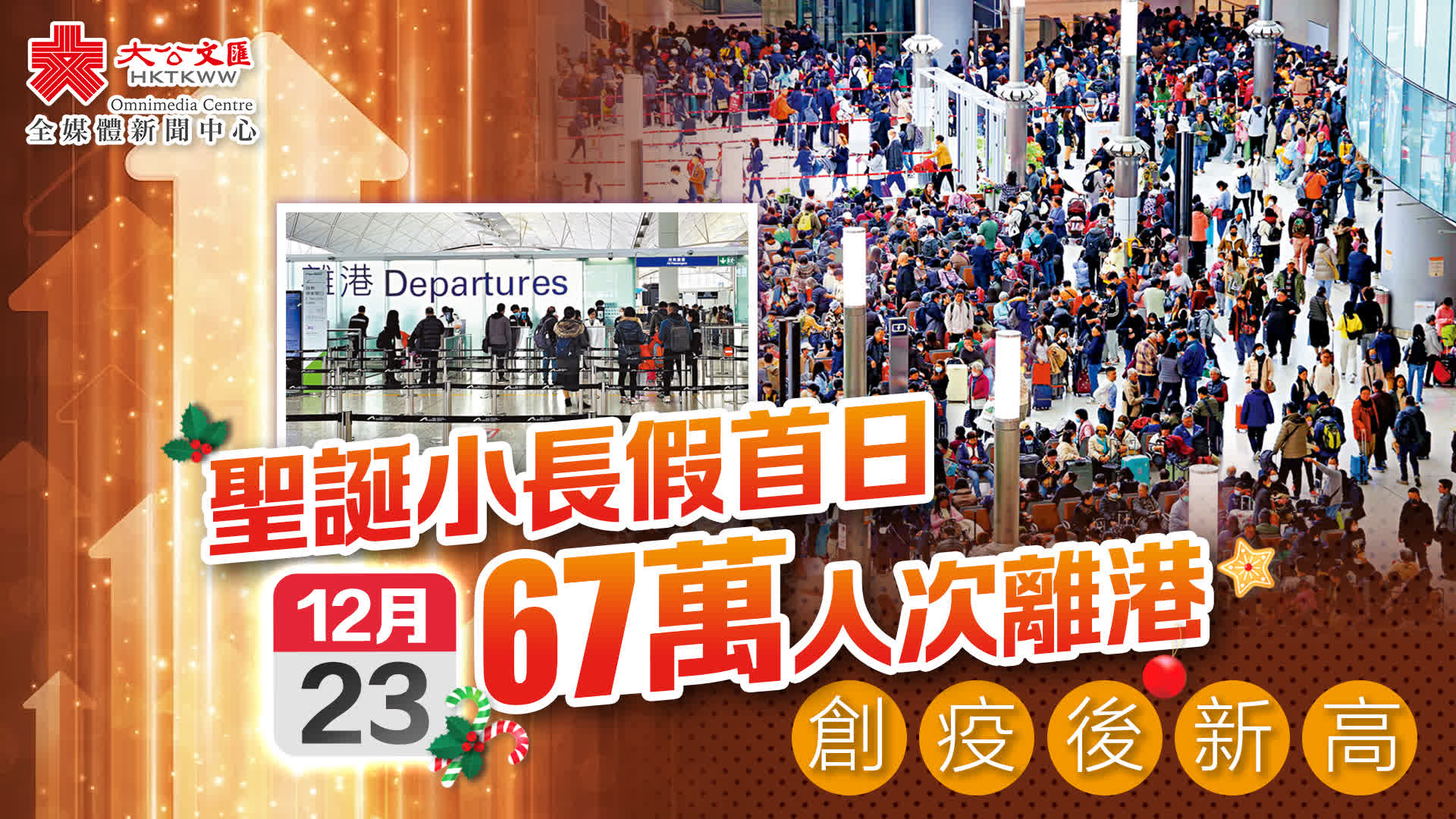 大公文匯全媒體報道,周末加聖誕小長假已開始,昨日(23日)本港全日錄得超過106萬人次經各個口岸出入境,是復常以來首次破百萬人次出入境。其中,有67萬人次出境,同樣創復常以來最高紀錄。香港居民單日淨流出超過31萬。