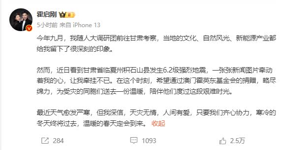 關鍵詞:霍啟剛郭晶晶捐款地震災區回應