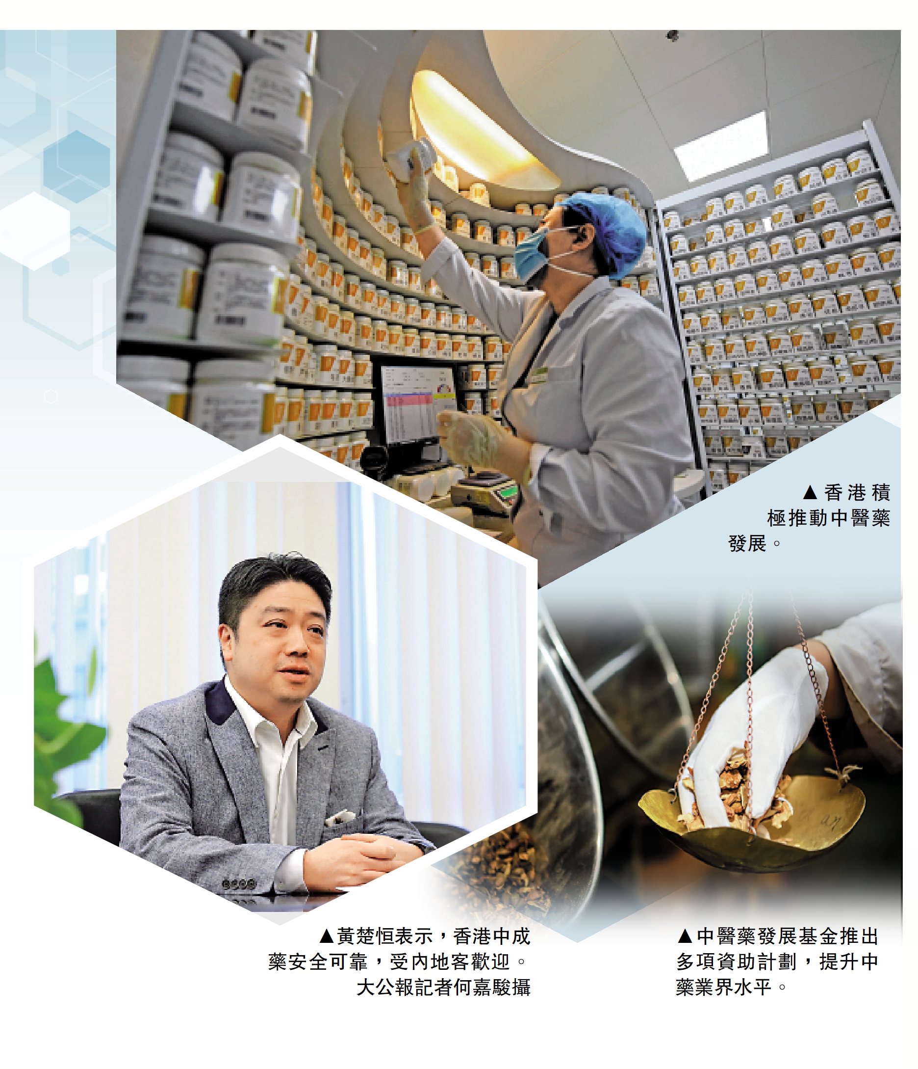 香港知名的中成藥多不勝數,陳李濟、馬百良、位元堂、余仁生等均為字號老、信譽好的品牌,深受海外華人及內地消費者歡迎,相關產品更成為許多內地旅客訪港必買之選。談及內地消費者對香港中成藥的印象,黃楚恒接受《大公報》訪問時表示,在很多內地消費者心中,香港中成藥製造嚴謹、安全可靠,值得信賴,因此香港中成藥擁有先天優勢。
