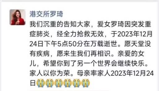 報道稱,羅琦的母親用羅琦的個人微信向羅琦的親朋好友宣告了此事。