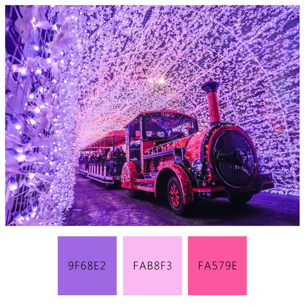 ↓2023年12月8日,在加拿大溫哥華的冬季博覽會上,人們乘坐觀光火車穿越燈光隧道。