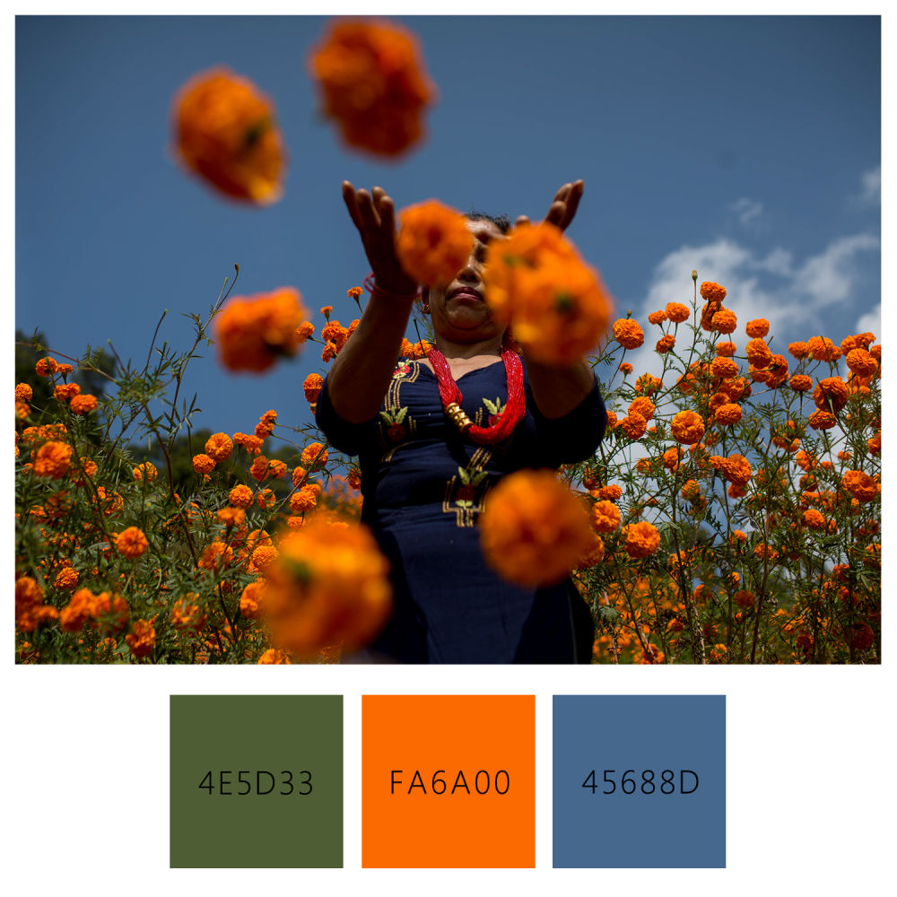 ↓2023年11月11日,一名女子在尼泊爾加德滿都採摘金盞花,用於製作排燈節裝飾品。