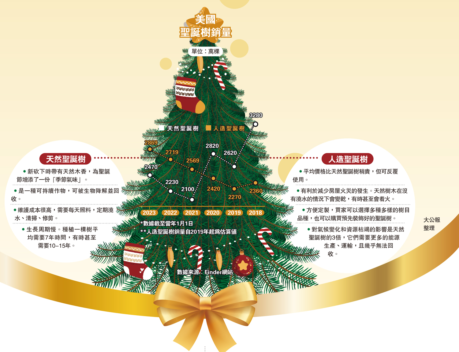 大公報綜合CNN、美國廣播公司及《紐約時報》報道:作為聖誕節不可或缺的一部分,聖誕樹在美國有着數十億美元的市場,天然樹和人造樹之爭更是一直存在的話題。美國聖誕樹協會今年的調查結果顯示,今年有77%的美國人將會選用人造聖誕樹,而非傳統的天然樹木。