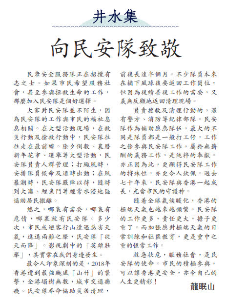負責搜救及清理行動的,還有警方、消防等紀律部隊。民安隊作為輔助應急隊伍,最大的不同是隊員都是一般打工仔,工作之餘參與民安隊工作,屬於無薪酬的義務工作,是純粹的奉獻。亦正因為此,更顯得民安隊工作的特殊性,亦更令人欽佩。過去七十年來,民安隊與香港一起成長,充當市民的守護神。
