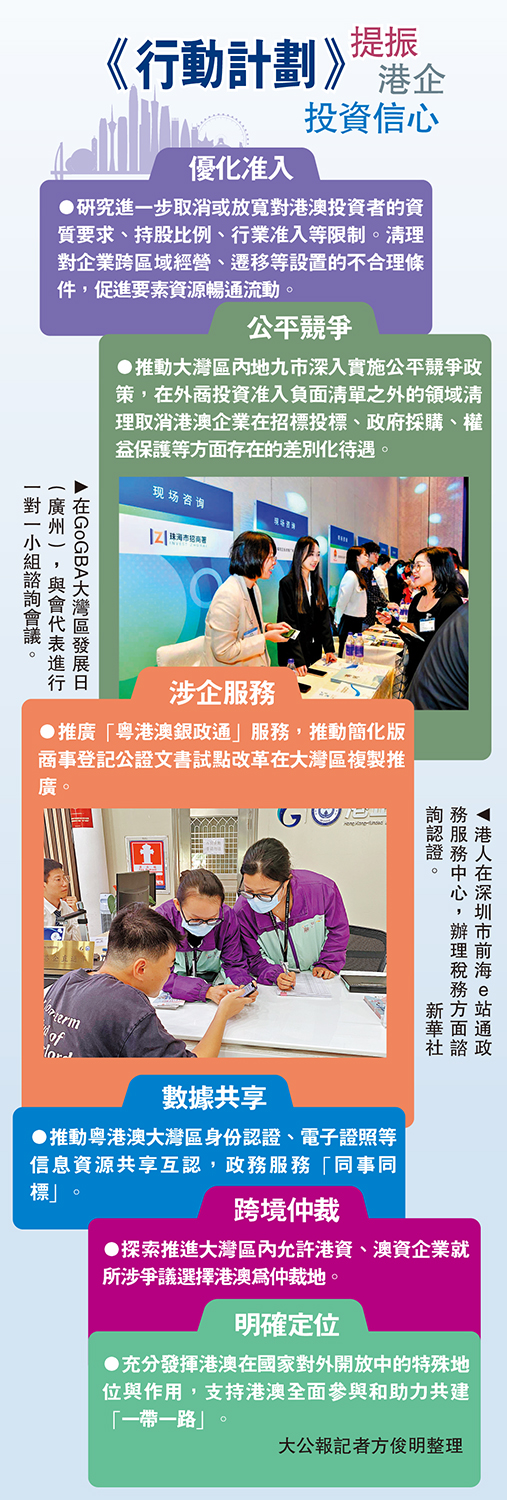 (大公報 記者 方俊明、黃寶儀、盧靜怡)國家發展改革委25日發布《粵港澳大灣區國際一流營商環境建設三年行動計劃》(下稱《行動計劃》),進一步深化粵港澳合作,打造市場化法治化國際化一流營商環境,提升大灣區市場一體化水平和國際競爭力。為營造統一高效、競爭有序的市場環境,《行動計劃》研究優化市場准入,進一步取消或放寬對港澳投資者的資質要求、持股比例、行業准入等限制;清理對企業跨區域經營、遷移等設置的不合理條件,促進要素資源暢通流動。同時,探索推進大灣區內允許港資、澳資企業就所涉爭議選擇港澳為仲裁地。
