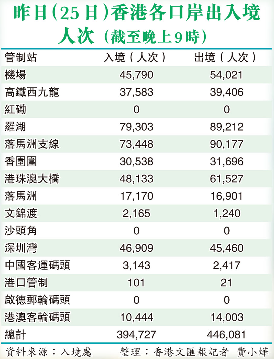 (香港文匯報記者 張弦)一連四天的聖誕節連周末假期,不少港人興致勃勃外遊。入境處數據顯示,截至昨晚9時,有84萬人次經各口岸出入境香港,出境佔44.6萬人次;入境39.4萬人次,首3天假期累積約295萬人次出入境香港。長假期將於今日完結,不少港人為避開返港人潮高峰昨日提早回港。香港文匯報記者昨日訪察西九龍高鐵站時,見到陸續有港人返港。他們均表示,內地食住行收費划算,一家三口每餐數百元有找,是香港收費的三分之一,菜式多元化,交通方便,酒店服務優質,旅遊體驗佳。